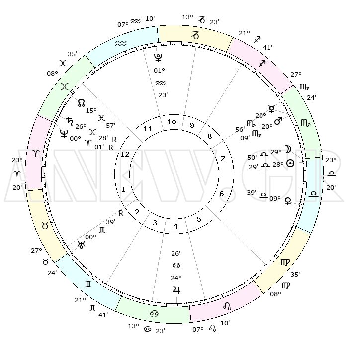 | ΘΕΣΕΙΣ ΠΛΑΝΗΤΩΝ ΑΣΤΡΟΛΟΓΙΚΟΥ ΧΑΡΤΗ ΤΗΣ ΣΤΙΓΜΗΣ ΑΥΤΗΣ | | Πλανήτης | Ζώδιο | Μοίρες | Δεκαήμ. | Σε οίκο | Απόκλιση | | Ακμές των οίκων | Ηλιος | Ζυγός | 28°08' | Τρίτο | 11 | 10 S 48 | | 1ος | 21°54' | Σκορπιός | Σελήνη | Ζυγός | 25°31' | Τρίτο | 11 | 12 S 48 | | 2ος | 22°03' | Τοξότης | Ερμής | Σκορπιός | 20°29' | Τρίτο | 12 | 20 S 07 | | 3ος | 26°29' | Αιγόκερως | Αφροδίτη | Ζυγός | 09°12' | Πρώτο | 11 | 02 S 14 | | 4ος | 02°12' | Ιχθείς | Αρης | Σκορπιός | 19°54' | Δεύτερο | 12 | 17 S 59 | | 5ος | 04°06' | Κριός | Δίας | Καρκίνος | 24°25' | Τρίτο | 8 | 21 N 17 | | 6ος | 00°15' | Ταύρος | Κρόνος | Ιχθείς | 26°29'R | Τρίτο | 4 | 03 S 41 | | 7ος | 21°54' | Ταύρος | Ουρανός | Δίδυμοι | 00°39'R | Πρώτο | 7 | 20 N 05 | | 8ος | 22°03' | Δίδυμοι | Ποσειδώνας | Κριός | 00°01'R | Πρώτο | 4 | 01 S 15 | | 9ος | 26°29' | Καρκίνος | Πλούτωνας | Υδροχόος | 01°23' | Πρώτο | 3 | 23 S 32 | | 10ος | 02°12' | Παρθένος | Β. Δεσμός | Ιχθείς | 15°58' | Δεύτερο | 4 | 05 S 32 | | 11ος | 04°06' | Ζυγός | Ωροσκόπος | Σκορπιός | 21°54' | Τρίτο | | | 12ος | 00°15' | Σκορπιός | Μεσουράνημα | Παρθένος | 02°12' | Πρώτο | | | |