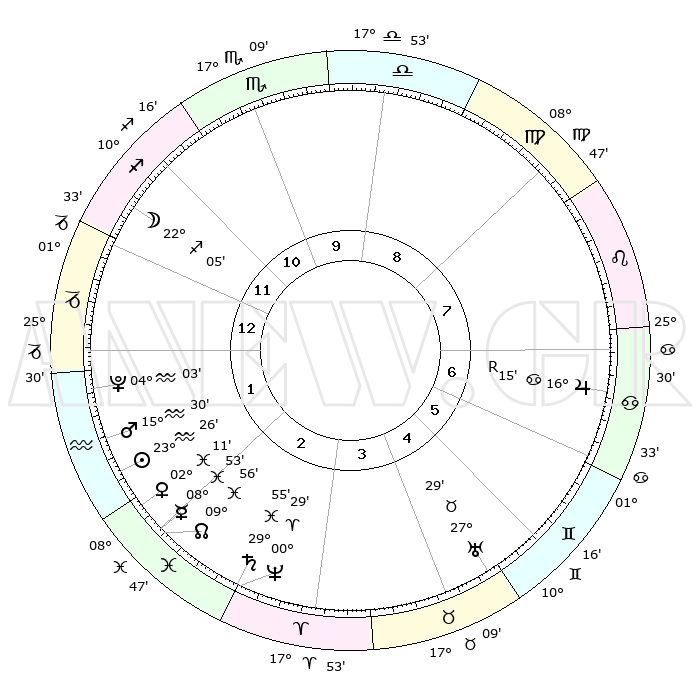 | | ΘΕΣΕΙΣ ΠΛΑΝΗΤΩΝ ΑΣΤΡΟΛΟΓΙΚΟΥ ΧΑΡΤΗ ΤΗΣ ΣΤΙΓΜΗΣ ΑΥΤΗΣ | | | | Πλανήτης | Ζώδιο | Μοίρες | Δεκαήμ. | Σε οίκο | Απόκλιση | | Ακμές των οίκων | | Ηλιος | Υδροχόος | 23°18' | Τρίτο | 3 | 13 S 45 | | 1ος | 10°06' | Τοξότης | | Σελήνη | Τοξότης | 20°29' | Τρίτο | 1 | 28 S 14 | | 2ος | 12°51' | Αιγόκερως | | Ερμής | Ιχθείς | 08°40' | Πρώτο | 3 | 08 S 50 | | 3ος | 20°15' | Υδροχόος | | Αφροδίτη | Ιχθείς | 02°01' | Πρώτο | 3 | 12 S 07 | | 4ος | 26°14' | Ιχθείς | | Αρης | Υδροχόος | 15°23' | Δεύτερο | 2 | 17 S 15 | | 5ος | 25°50' | Κριός | | Δίας | Καρκίνος | 16°16'R | Δεύτερο | 8 | 22 N 46 | | 6ος | 19°34' | Ταύρος | | Κρόνος | Ιχθείς | 29°54' | Τρίτο | 4 | 02 S 01 | | 7ος | 10°06' | Δίδυμοι | | Ουρανός | Ταύρος | 27°29' | Τρίτο | 6 | 19 N 25 | | 8ος | 12°51' | Καρκίνος | | Ποσειδώνας | Κριός | 00°28' | Πρώτο | 4 | 01 S 01 | | 9ος | 20°15' | Λέων | | Πλούτωνας | Υδροχόος | 04°03' | Πρώτο | 2 | 22 S 57 | | 10ος | 26°14' | Παρθένος | | Β. Δεσμός | Ιχθείς | 09°57' | Πρώτο | 3 | 07 S 50 | | 11ος | 25°50' | Ζυγός | | Ωροσκόπος | Τοξότης | 10°06' | Δεύτερο | | | 12ος | 19°34' | Σκορπιός | | Μεσουράνημα | Παρθένος | 26°14' | Τρίτο | | | |