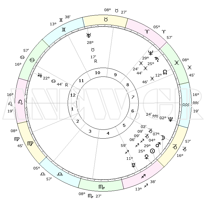 | | ΘΕΣΕΙΣ ΠΛΑΝΗΤΩΝ ΑΣΤΡΟΛΟΓΙΚΟΥ ΧΑΡΤΗ ΤΗΣ ΣΤΙΓΜΗΣ ΑΥΤΗΣ | | | | Πλανήτης | Ζώδιο | Μοίρες | Δεκαήμ. | Σε οίκο | Απόκλιση | | Ακμές των οίκων | | Ηλιος | Τοξότης | 29°03' | Τρίτο | 6 | 23 S 26 | | 1ος | 21°35' | Καρκίνος | | Σελήνη | Αιγόκερως | 06°00' | Πρώτο | 6 | 27 S 52 | | 2ος | 12°11' | Λέων | | Ερμής | Τοξότης | 11°52' | Δεύτερο | 5 | 21 S 24 | | 3ος | 06°07' | Παρθένος | | Αφροδίτη | Τοξότης | 24°60' | Τρίτο | 6 | 23 S 24 | | 4ος | 05°58' | Ζυγός | | Αρης | Αιγόκερως | 04°05' | Πρώτο | 6 | 24 S 11 | | 5ος | 12°01' | Σκορπιός | | Δίας | Καρκίνος | 22°45'R | Τρίτο | 1 | 21 N 43 | | 6ος | 19°08' | Τοξότης | | Κρόνος | Ιχθείς | 25°44' | Τρίτο | 9 | 03 S 48 | | 7ος | 21°35' | Αιγόκερως | | Ουρανός | Ταύρος | 28°18'R | Τρίτο | 11 | 19 N 35 | | 8ος | 12°11' | Υδροχόος | | Ποσειδώνας | Ιχθείς | 29°24' | Τρίτο | 9 | 01 S 28 | | 9ος | 06°07' | Ιχθείς | | Πλούτωνας | Υδροχόος | 02°24' | Πρώτο | 7 | 23 S 17 | | 10ος | 05°58' | Κριός | | Β. Δεσμός | Ιχθείς | 12°46' | Δεύτερο | 9 | 06 S 46 | | 11ος | 12°01' | Ταύρος | | Ωροσκόπος | Καρκίνος | 21°35' | Τρίτο | | | 12ος | 19°08' | Δίδυμοι | | Μεσουράνημα | Κριός | 05°58' | Πρώτο | | | |