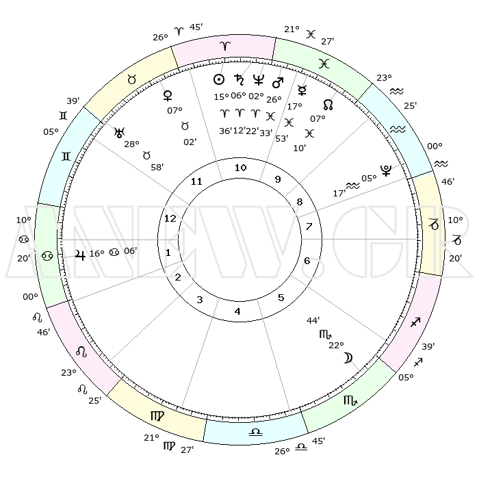 | | ΘΕΣΕΙΣ ΠΛΑΝΗΤΩΝ ΑΣΤΡΟΛΟΓΙΚΟΥ ΧΑΡΤΗ ΤΗΣ ΣΤΙΓΜΗΣ ΑΥΤΗΣ | | | | Πλανήτης | Ζώδιο | Μοίρες | Δεκαήμ. | Σε οίκο | Απόκλιση | | Ακμές των οίκων | | Ηλιος | Κριός | 15°18' | Δεύτερο | 2 | 06 N 02 | | 1ος | 21°20' | Υδροχόος | | Σελήνη | Σκορπιός | 19°10' | Δεύτερο | 9 | 22 S 12 | | 2ος | 07°08' | Κριός | | Ερμής | Ιχθείς | 17°34' | Δεύτερο | 1 | 06 S 38 | | 3ος | 11°35' | Ταύρος | | Αφροδίτη | Ταύρος | 06°40' | Πρώτο | 2 | 13 N 29 | | 4ος | 06°56' | Δίδυμοι | | Αρης | Ιχθείς | 26°19' | Τρίτο | 1 | 02 S 25 | | 5ος | 28°43' | Δίδυμοι | | Δίας | Καρκίνος | 16°04' | Δεύτερο | 5 | 22 N 50 | | 6ος | 21°28' | Καρκίνος | | Κρόνος | Κριός | 06°10' | Πρώτο | 1 | 00 N 29 | | 7ος | 21°20' | Λέων | | Ουρανός | Ταύρος | 28°57' | Τρίτο | 3 | 19 N 45 | | 8ος | 07°08' | Ζυγός | | Ποσειδώνας | Κριός | 02°22' | Πρώτο | 1 | 00 S 16 | | 9ος | 11°35' | Σκορπιός | | Πλούτωνας | Υδροχόος | 05°17' | Πρώτο | 12 | 22 S 47 | | 10ος | 06°56' | Τοξότης | | Β. Δεσμός | Ιχθείς | 07°11' | Πρώτο | 1 | 08 S 52 | | 11ος | 28°43' | Τοξότης | | Ωροσκόπος | Υδροχόος | 21°20' | Τρίτο | | | 12ος | 21°28' | Αιγόκερως | | Μεσουράνημα | Τοξότης | 06°56' | Πρώτο | | | |