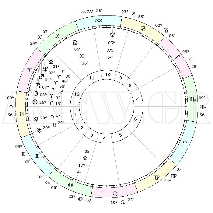 | | ΘΕΣΕΙΣ ΠΛΑΝΗΤΩΝ ΑΣΤΡΟΛΟΓΙΚΟΥ ΧΑΡΤΗ ΤΗΣ ΣΤΙΓΜΗΣ ΑΥΤΗΣ | | | | Πλανήτης | Ζώδιο | Μοίρες | Δεκαήμ. | Σε οίκο | Απόκλιση | | Ακμές των οίκων | | Ηλιος | Κριός | 26°09' | Τρίτο | 1 | 10 N 06 | | 1ος | 01°12' | Κριός | | Σελήνη | Κριός | 07°32' | Πρώτο | 1 | 05 N 19 | | 2ος | 11°12' | Ταύρος | | Ερμής | Κριός | 01°24' | Πρώτο | 1 | 01 S 51 | | 3ος | 08°25' | Δίδυμοι | | Αφροδίτη | Ταύρος | 20°12' | Τρίτο | 2 | 18 N 00 | | 4ος | 00°40' | Καρκίνος | | Αρης | Κριός | 04°54' | Πρώτο | 1 | 01 N 03 | | 5ος | 23°02' | Καρκίνος | | Δίας | Καρκίνος | 17°05' | Δεύτερο | 4 | 22 N 43 | | 6ος | 20°37' | Λέων | | Κρόνος | Κριός | 07°31' | Πρώτο | 1 | 01 N 01 | | 7ος | 01°12' | Ζυγός | | Ουρανός | Ταύρος | 29°29' | Τρίτο | 2 | 19 N 52 | | 8ος | 11°12' | Σκορπιός | | Ποσειδώνας | Κριός | 02°46' | Πρώτο | 1 | 00 S 06 | | 9ος | 08°25' | Τοξότης | | Πλούτωνας | Υδροχόος | 05°25' | Πρώτο | 11 | 22 S 47 | | 10ος | 00°40' | Αιγόκερως | | Β. Δεσμός | Ιχθείς | 06°36' | Πρώτο | 12 | 09 S 05 | | 11ος | 23°02' | Αιγόκερως | | Ωροσκόπος | Κριός | 01°12' | Πρώτο | | | 12ος | 20°37' | Υδροχόος | | Μεσουράνημα | Αιγόκερως | 00°40' | Πρώτο | | | |