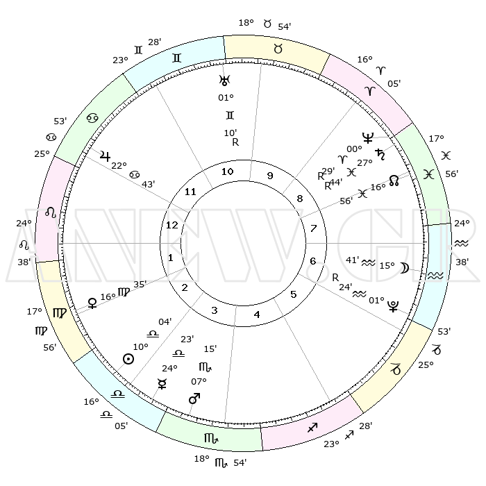 | ΘΕΣΕΙΣ ΠΛΑΝΗΤΩΝ ΑΣΤΡΟΛΟΓΙΚΟΥ ΧΑΡΤΗ ΤΗΣ ΣΤΙΓΜΗΣ ΑΥΤΗΣ | | Πλανήτης | Ζώδιο | Μοίρες | Δεκαήμ. | Σε οίκο | Απόκλιση | | Ακμές των οίκων | Ηλιος | Ζυγός | 10°01' | Δεύτερο | 3 | 03 S 58 | | 1ος | 07°21' | Λέων | Σελήνη | Υδροχόος | 14°53' | Δεύτερο | 7 | 19 S 08 | | 2ος | 28°56' | Λέων | Ερμής | Ζυγός | 24°18' | Τρίτο | 3 | 09 S 44 | | 3ος | 24°59' | Παρθένος | Αφροδίτη | Παρθένος | 16°30' | Δεύτερο | 2 | 06 N 33 | | 4ος | 26°49' | Ζυγός | Αρης | Σκορπιός | 07°13' | Πρώτο | 4 | 14 S 01 | | 5ος | 02°35' | Τοξότης | Δίας | Καρκίνος | 22°42' | Τρίτο | 12 | 21 N 33 | | 6ος | 07°07' | Αιγόκερως | Κρόνος | Ιχθείς | 27°44'R | Τρίτο | 9 | 03 S 12 | | 7ος | 07°21' | Υδροχόος | Ουρανός | Δίδυμοι | 01°10'R | Πρώτο | 10 | 20 N 11 | | 8ος | 28°56' | Υδροχόος | Ποσειδώνας | Κριός | 00°30'R | Πρώτο | 9 | 01 S 04 | | 9ος | 24°59' | Ιχθείς | Πλούτωνας | Υδροχόος | 01°24'R | Πρώτο | 6 | 23 S 32 | | 10ος | 26°49' | Κριός | Β. Δεσμός | Ιχθείς | 16°56' | Δεύτερο | 8 | 05 S 09 | | 11ος | 02°35' | Δίδυμοι | Ωροσκόπος | Λέων | 07°21' | Πρώτο | | | 12ος | 07°07' | Καρκίνος | Μεσουράνημα | Κριός | 26°49' | Τρίτο | | | |