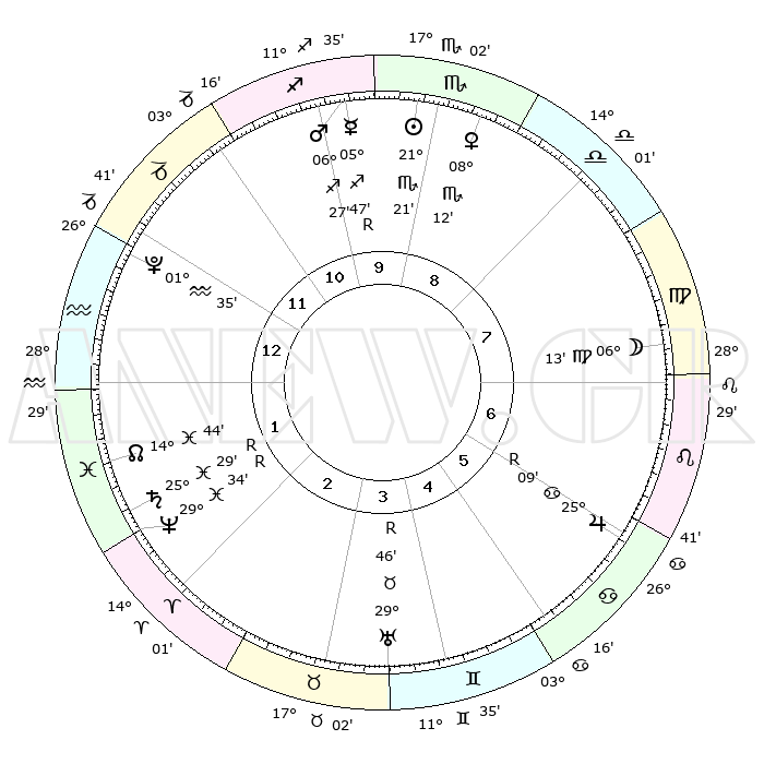 | | ΘΕΣΕΙΣ ΠΛΑΝΗΤΩΝ ΑΣΤΡΟΛΟΓΙΚΟΥ ΧΑΡΤΗ ΤΗΣ ΣΤΙΓΜΗΣ ΑΥΤΗΣ | | | | Πλανήτης | Ζώδιο | Μοίρες | Δεκαήμ. | Σε οίκο | Απόκλιση | | Ακμές των οίκων | | Ηλιος | Σκορπιός | 21°16' | Τρίτο | 10 | 18 S 04 | | 1ος | 24°42' | Αιγόκερως | | Σελήνη | Παρθένος | 05°18' | Πρώτο | 7 | 10 N 27 | | 2ος | 07°50' | Ιχθείς | | Ερμής | Τοξότης | 05°50'R | Πρώτο | 10 | 22 S 53 | | 3ος | 17°02' | Κριός | | Αφροδίτη | Σκορπιός | 08°07' | Πρώτο | 9 | 13 S 02 | | 4ος | 16°27' | Ταύρος | | Αρης | Τοξότης | 06°24' | Πρώτο | 10 | 21 S 52 | | 5ος | 09°38' | Δίδυμοι | | Δίας | Καρκίνος | 25°09'R | Τρίτο | 7 | 21 N 13 | | 6ος | 00°54' | Καρκίνος | | Κρόνος | Ιχθείς | 25°29'R | Τρίτο | 2 | 04 S 02 | | 7ος | 24°42' | Καρκίνος | | Ουρανός | Ταύρος | 29°47'R | Τρίτο | 4 | 19 N 54 | | 8ος | 07°50' | Παρθένος | | Ποσειδώνας | Ιχθείς | 29°34'R | Τρίτο | 2 | 01 S 25 | | 9ος | 17°02' | Ζυγός | | Πλούτωνας | Υδροχόος | 01°35' | Πρώτο | 1 | 23 S 29 | | 10ος | 16°27' | Σκορπιός | | Β. Δεσμός | Ιχθείς | 14°45' | Δεύτερο | 2 | 06 S 00 | | 11ος | 09°38' | Τοξότης | | Ωροσκόπος | Αιγόκερως | 24°42' | Τρίτο | | | 12ος | 00°54' | Αιγόκερως | | Μεσουράνημα | Σκορπιός | 16°27' | Δεύτερο | | | |