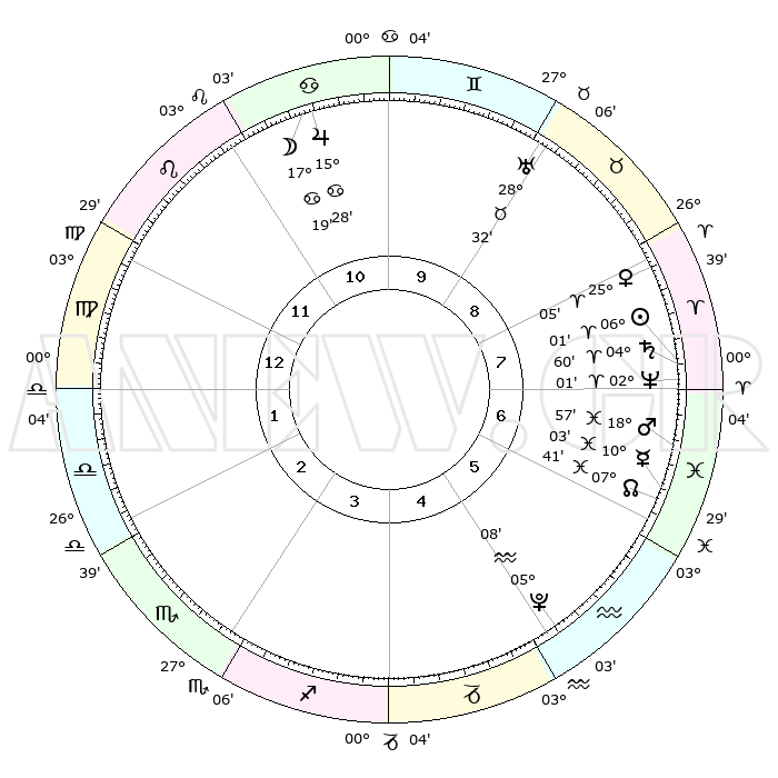 | | ΘΕΣΕΙΣ ΠΛΑΝΗΤΩΝ ΑΣΤΡΟΛΟΓΙΚΟΥ ΧΑΡΤΗ ΤΗΣ ΣΤΙΓΜΗΣ ΑΥΤΗΣ | | | | Πλανήτης | Ζώδιο | Μοίρες | Δεκαήμ. | Σε οίκο | Απόκλιση | | Ακμές των οίκων | | Ηλιος | Κριός | 05°56' | Πρώτο | 8 | 02 N 22 | | 1ος | 07°36' | Παρθένος | | Σελήνη | Καρκίνος | 16°15' | Δεύτερο | 11 | 26 N 34 | | 2ος | 02°14' | Ζυγός | | Ερμής | Ιχθείς | 10°01' | Δεύτερο | 7 | 08 S 07 | | 3ος | 01°31' | Σκορπιός | | Αφροδίτη | Κριός | 24°59' | Τρίτο | 8 | 09 N 04 | | 4ος | 04°28' | Τοξότης | | Αρης | Ιχθείς | 18°54' | Δεύτερο | 7 | 05 S 22 | | 5ος | 08°12' | Αιγόκερως | | Δίας | Καρκίνος | 15°28' | Δεύτερο | 11 | 22 N 54 | | 6ος | 09°37' | Υδροχόος | | Κρόνος | Κριός | 04°59' | Πρώτο | 8 | 00 N 02 | | 7ος | 07°36' | Ιχθείς | | Ουρανός | Ταύρος | 28°32' | Τρίτο | 9 | 19 N 40 | | 8ος | 02°14' | Κριός | | Ποσειδώνας | Κριός | 02°00' | Πρώτο | 7 | 00 S 24 | | 9ος | 01°31' | Ταύρος | | Πλούτωνας | Υδροχόος | 05°07' | Πρώτο | 5 | 22 S 48 | | 10ος | 04°28' | Δίδυμοι | | Β. Δεσμός | Ιχθείς | 07°41' | Πρώτο | 7 | 08 S 41 | | 11ος | 08°12' | Καρκίνος | | Ωροσκόπος | Παρθένος | 07°36' | Πρώτο | | | 12ος | 09°37' | Λέων | | Μεσουράνημα | Δίδυμοι | 04°28' | Πρώτο | | | |