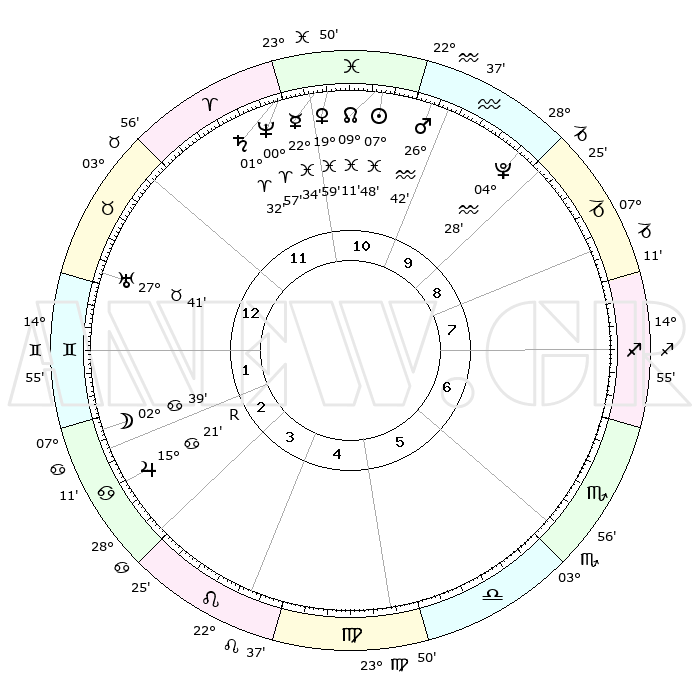 | | ΘΕΣΕΙΣ ΠΛΑΝΗΤΩΝ ΑΣΤΡΟΛΟΓΙΚΟΥ ΧΑΡΤΗ ΤΗΣ ΣΤΙΓΜΗΣ ΑΥΤΗΣ | | | | Πλανήτης | Ζώδιο | Μοίρες | Δεκαήμ. | Σε οίκο | Απόκλιση | | Ακμές των οίκων | | Ηλιος | Ιχθείς | 07°44' | Πρώτο | 11 | 08 S 40 | | 1ος | 18°30' | Ταύρος | | Σελήνη | Καρκίνος | 01°45' | Πρώτο | 2 | 28 N 18 | | 2ος | 15°53' | Δίδυμοι | | Ερμής | Ιχθείς | 22°34' | Τρίτο | 11 | 00 S 23 | | 3ος | 07°53' | Καρκίνος | | Αφροδίτη | Ιχθείς | 19°54' | Δεύτερο | 11 | 05 S 17 | | 4ος | 29°58' | Καρκίνος | | Αρης | Υδροχόος | 26°39' | Τρίτο | 11 | 13 S 39 | | 5ος | 26°37' | Λέων | | Δίας | Καρκίνος | 15°21'R | Δεύτερο | 3 | 22 N 53 | | 6ος | 03°01' | Ζυγός | | Κρόνος | Κριός | 01°31' | Πρώτο | 11 | 01 S 21 | | 7ος | 18°30' | Σκορπιός | | Ουρανός | Ταύρος | 27°41' | Τρίτο | 1 | 19 N 28 | | 8ος | 15°53' | Τοξότης | | Ποσειδώνας | Κριός | 00°57' | Πρώτο | 11 | 00 S 49 | | 9ος | 07°53' | Αιγόκερως | | Πλούτωνας | Υδροχόος | 04°28' | Πρώτο | 10 | 22 S 53 | | 10ος | 29°58' | Αιγόκερως | | Β. Δεσμός | Ιχθείς | 09°11' | Πρώτο | 11 | 08 S 07 | | 11ος | 26°37' | Υδροχόος | | Ωροσκόπος | Ταύρος | 18°30' | Δεύτερο | | | 12ος | 03°01' | Κριός | | Μεσουράνημα | Αιγόκερως | 29°58' | Τρίτο | | | |
