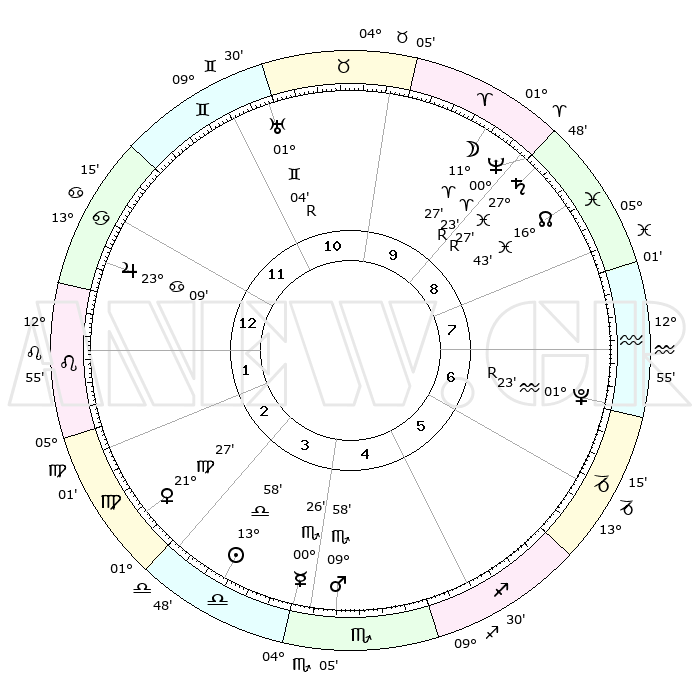 | ΘΕΣΕΙΣ ΠΛΑΝΗΤΩΝ ΑΣΤΡΟΛΟΓΙΚΟΥ ΧΑΡΤΗ ΤΗΣ ΣΤΙΓΜΗΣ ΑΥΤΗΣ | | Πλανήτης | Ζώδιο | Μοίρες | Δεκαήμ. | Σε οίκο | Απόκλιση | | Ακμές των οίκων | Ηλιος | Ζυγός | 13°52' | Δεύτερο | 4 | 05 S 28 | | 1ος | 15°45' | Καρκίνος | Σελήνη | Κριός | 10°05' | Δεύτερο | 10 | 05 N 47 | | 2ος | 06°12' | Λέων | Ερμής | Σκορπιός | 00°18' | Πρώτο | 4 | 12 S 20 | | 3ος | 29°26' | Λέων | Αφροδίτη | Παρθένος | 21°21' | Τρίτο | 3 | 04 N 44 | | 4ος | 28°22' | Παρθένος | Αρης | Σκορπιός | 09°54' | Πρώτο | 5 | 14 S 55 | | 5ος | 04°08' | Σκορπιός | Δίας | Καρκίνος | 23°09' | Τρίτο | 1 | 21 N 29 | | 6ος | 12°13' | Τοξότης | Κρόνος | Ιχθείς | 27°27'R | Τρίτο | 9 | 03 S 19 | | 7ος | 15°45' | Αιγόκερως | Ουρανός | Δίδυμοι | 01°04'R | Πρώτο | 11 | 20 N 10 | | 8ος | 06°12' | Υδροχόος | Ποσειδώνας | Κριός | 00°23'R | Πρώτο | 10 | 01 S 06 | | 9ος | 29°26' | Υδροχόος | Πλούτωνας | Υδροχόος | 01°23'R | Πρώτο | 7 | 23 S 32 | | 10ος | 28°22' | Ιχθείς | Β. Δεσμός | Ιχθείς | 16°44' | Δεύτερο | 9 | 05 S 14 | | 11ος | 04°08' | Ταύρος | Ωροσκόπος | Καρκίνος | 15°45' | Δεύτερο | | | 12ος | 12°13' | Δίδυμοι | Μεσουράνημα | Ιχθείς | 28°22' | Τρίτο | | | |