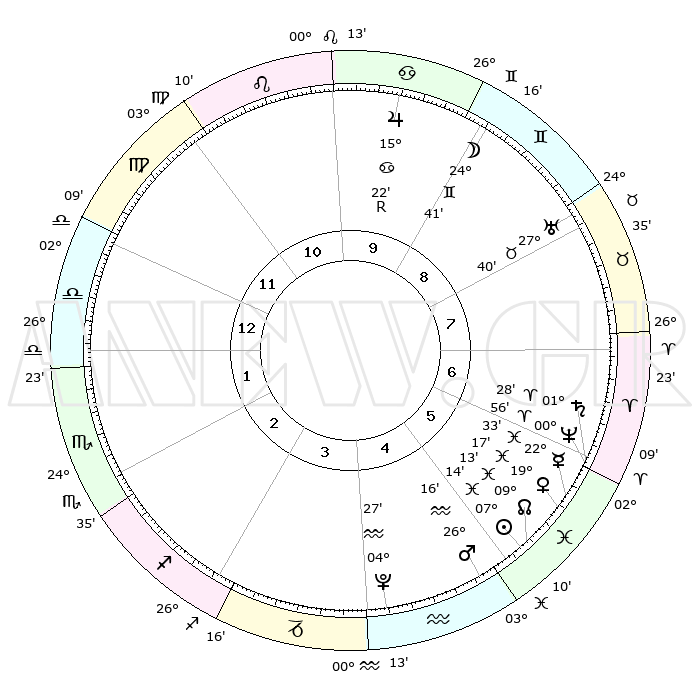 | | ΘΕΣΕΙΣ ΠΛΑΝΗΤΩΝ ΑΣΤΡΟΛΟΓΙΚΟΥ ΧΑΡΤΗ ΤΗΣ ΣΤΙΓΜΗΣ ΑΥΤΗΣ | | | | Πλανήτης | Ζώδιο | Μοίρες | Δεκαήμ. | Σε οίκο | Απόκλιση | | Ακμές των οίκων | | Ηλιος | Ιχθείς | 07°11' | Πρώτο | 5 | 08 S 52 | | 1ος | 08°15' | Ζυγός | | Σελήνη | Δίδυμοι | 23°48' | Τρίτο | 9 | 28 N 23 | | 2ος | 05°24' | Σκορπιός | | Ερμής | Ιχθείς | 22°33' | Τρίτο | 6 | 00 S 30 | | 3ος | 06°09' | Τοξότης | | Αφροδίτη | Ιχθείς | 19°12' | Δεύτερο | 6 | 05 S 34 | | 4ος | 09°17' | Αιγόκερως | | Αρης | Υδροχόος | 26°13' | Τρίτο | 5 | 13 S 48 | | 5ος | 12°13' | Υδροχόος | | Δίας | Καρκίνος | 15°23'R | Δεύτερο | 10 | 22 N 53 | | 6ος | 12°18' | Ιχθείς | | Κρόνος | Κριός | 01°27' | Πρώτο | 6 | 01 S 23 | | 7ος | 08°15' | Κριός | | Ουρανός | Ταύρος | 27°40' | Τρίτο | 8 | 19 N 27 | | 8ος | 05°24' | Ταύρος | | Ποσειδώνας | Κριός | 00°56' | Πρώτο | 6 | 00 S 50 | | 9ος | 06°09' | Δίδυμοι | | Πλούτωνας | Υδροχόος | 04°27' | Πρώτο | 4 | 22 S 53 | | 10ος | 09°17' | Καρκίνος | | Β. Δεσμός | Ιχθείς | 09°13' | Πρώτο | 5 | 08 S 07 | | 11ος | 12°13' | Λέων | | Ωροσκόπος | Ζυγός | 08°15' | Πρώτο | | | 12ος | 12°18' | Παρθένος | | Μεσουράνημα | Καρκίνος | 09°17' | Πρώτο | | | |