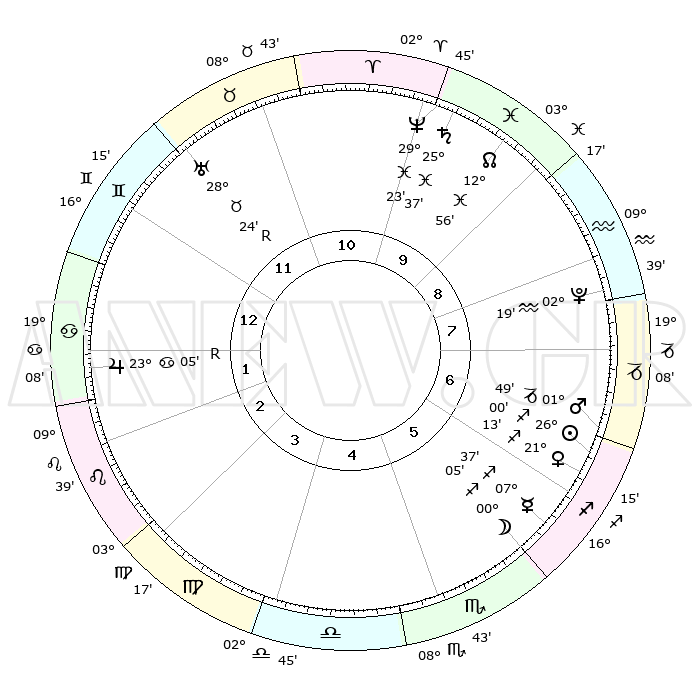 | | ΘΕΣΕΙΣ ΠΛΑΝΗΤΩΝ ΑΣΤΡΟΛΟΓΙΚΟΥ ΧΑΡΤΗ ΤΗΣ ΣΤΙΓΜΗΣ ΑΥΤΗΣ | | | | Πλανήτης | Ζώδιο | Μοίρες | Δεκαήμ. | Σε οίκο | Απόκλιση | | Ακμές των οίκων | | Ηλιος | Τοξότης | 25°55' | Τρίτο | 7 | 23 S 22 | | 1ος | 21°25' | Δίδυμοι | | Σελήνη | Σκορπιός | 29°04' | Τρίτο | 6 | 24 S 41 | | 2ος | 12°55' | Καρκίνος | | Ερμής | Τοξότης | 07°30' | Πρώτο | 6 | 20 S 22 | | 3ος | 04°17' | Λέων | | Αφροδίτη | Τοξότης | 21°07' | Τρίτο | 6 | 23 S 05 | | 4ος | 29°19' | Λέων | | Αρης | Αιγόκερως | 01°45' | Πρώτο | 7 | 24 S 13 | | 5ος | 01°46' | Ζυγός | | Δίας | Καρκίνος | 23°05'R | Τρίτο | 2 | 21 N 39 | | 6ος | 12°04' | Σκορπιός | | Κρόνος | Ιχθείς | 25°37' | Τρίτο | 10 | 03 S 52 | | 7ος | 21°25' | Τοξότης | | Ουρανός | Ταύρος | 28°24'R | Τρίτο | 12 | 19 N 36 | | 8ος | 12°55' | Αιγόκερως | | Ποσειδώνας | Ιχθείς | 29°23' | Τρίτο | 10 | 01 S 29 | | 9ος | 04°17' | Υδροχόος | | Πλούτωνας | Υδροχόος | 02°19' | Πρώτο | 8 | 23 S 18 | | 10ος | 29°19' | Υδροχόος | | Β. Δεσμός | Ιχθείς | 12°56' | Δεύτερο | 10 | 06 S 42 | | 11ος | 01°46' | Κριός | | Ωροσκόπος | Δίδυμοι | 21°25' | Τρίτο | | | 12ος | 12°04' | Ταύρος | | Μεσουράνημα | Υδροχόος | 29°19' | Τρίτο | | | |