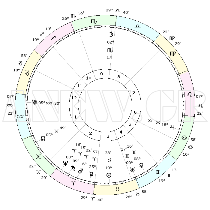 | | ΘΕΣΕΙΣ ΠΛΑΝΗΤΩΝ ΑΣΤΡΟΛΟΓΙΚΟΥ ΧΑΡΤΗ ΤΗΣ ΣΤΙΓΜΗΣ ΑΥΤΗΣ | | | | Πλανήτης | Ζώδιο | Μοίρες | Δεκαήμ. | Σε οίκο | Απόκλιση | | Ακμές των οίκων | | Ηλιος | Ταύρος | 10°35' | Δεύτερο | 4 | 15 N 00 | | 1ος | 17°44' | Αιγόκερως | | Σελήνη | Σκορπιός | 01°42' | Πρώτο | 9 | 15 S 56 | | 2ος | 29°21' | Υδροχόος | | Ερμής | Κριός | 25°51' | Τρίτο | 3 | 08 N 11 | | 3ος | 09°17' | Κριός | | Αφροδίτη | Δίδυμοι | 08°13' | Πρώτο | 5 | 22 N 33 | | 4ος | 09°59' | Ταύρος | | Αρης | Κριός | 16°20' | Δεύτερο | 3 | 05 N 36 | | 5ος | 03°53' | Δίδυμοι | | Δίας | Καρκίνος | 18°54' | Δεύτερο | 7 | 22 N 29 | | 6ος | 25°05' | Δίδυμοι | | Κρόνος | Κριός | 09°15' | Πρώτο | 2 | 01 N 40 | | 7ος | 17°44' | Καρκίνος | | Ουρανός | Δίδυμοι | 00°16' | Πρώτο | 4 | 20 N 03 | | 8ος | 29°21' | Λέων | | Ποσειδώνας | Κριός | 03°16' | Πρώτο | 2 | 00 N 05 | | 9ος | 09°17' | Ζυγός | | Πλούτωνας | Υδροχόος | 05°30' | Πρώτο | 1 | 22 S 49 | | 10ος | 09°59' | Σκορπιός | | Β. Δεσμός | Ιχθείς | 05°49' | Πρώτο | 2 | 09 S 23 | | 11ος | 03°53' | Τοξότης | | Ωροσκόπος | Αιγόκερως | 17°44' | Δεύτερο | | | 12ος | 25°05' | Τοξότης | | Μεσουράνημα | Σκορπιός | 09°59' | Πρώτο | | | |