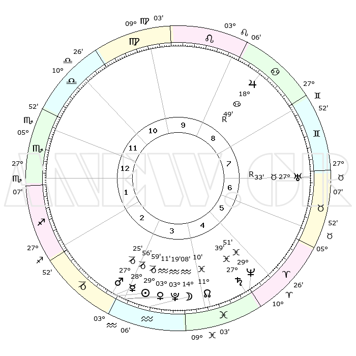 | | ΘΕΣΕΙΣ ΠΛΑΝΗΤΩΝ ΑΣΤΡΟΛΟΓΙΚΟΥ ΧΑΡΤΗ ΤΗΣ ΣΤΙΓΜΗΣ ΑΥΤΗΣ | | | | Πλανήτης | Ζώδιο | Μοίρες | Δεκαήμ. | Σε οίκο | Απόκλιση | | Ακμές των οίκων | | Ηλιος | Αιγόκερως | 29°53' | Τρίτο | 3 | 20 S 10 | | 1ος | 29°19' | Ζυγός | | Σελήνη | Υδροχόος | 12°55' | Δεύτερο | 4 | 19 S 09 | | 2ος | 27°42' | Σκορπιός | | Ερμής | Αιγόκερως | 28°46' | Τρίτο | 3 | 22 S 22 | | 3ος | 29°36' | Τοξότης | | Αφροδίτη | Υδροχόος | 03°03' | Πρώτο | 3 | 20 S 33 | | 4ος | 03°44' | Υδροχόος | | Αρης | Αιγόκερως | 27°20' | Τρίτο | 3 | 21 S 40 | | 5ος | 06°40' | Ιχθείς | | Δίας | Καρκίνος | 18°49'R | Δεύτερο | 9 | 22 N 23 | | 6ος | 05°24' | Κριός | | Κρόνος | Ιχθείς | 27°39' | Τρίτο | 5 | 02 S 57 | | 7ος | 29°19' | Κριός | | Ουρανός | Ταύρος | 27°33'R | Τρίτο | 7 | 19 N 25 | | 8ος | 27°42' | Ταύρος | | Ποσειδώνας | Ιχθείς | 29°50' | Τρίτο | 5 | 01 S 17 | | 9ος | 29°36' | Δίδυμοι | | Πλούτωνας | Υδροχόος | 03°19' | Πρώτο | 3 | 23 S 06 | | 10ος | 03°44' | Λέων | | Β. Δεσμός | Ιχθείς | 11°10' | Δεύτερο | 5 | 07 S 23 | | 11ος | 06°40' | Παρθένος | | Ωροσκόπος | Ζυγός | 29°19' | Τρίτο | | | 12ος | 05°24' | Ζυγός | | Μεσουράνημα | Λέων | 03°44' | Πρώτο | | | |