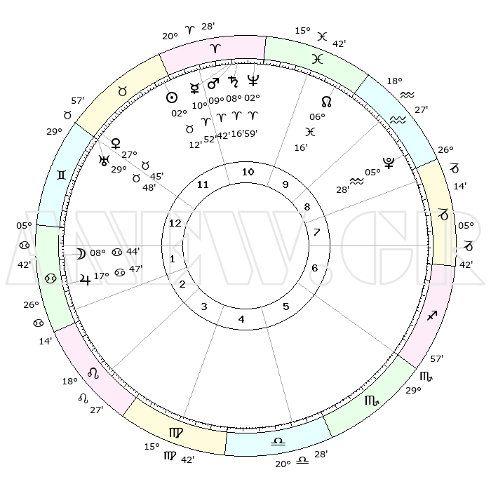| | ΘΕΣΕΙΣ ΠΛΑΝΗΤΩΝ ΑΣΤΡΟΛΟΓΙΚΟΥ ΧΑΡΤΗ ΤΗΣ ΣΤΙΓΜΗΣ ΑΥΤΗΣ | | | | Πλανήτης | Ζώδιο | Μοίρες | Δεκαήμ. | Σε οίκο | Απόκλιση | | Ακμές των οίκων | | Ηλιος | Ταύρος | 02°08' | Πρώτο | 11 | 12 N 13 | | 1ος | 13°57' | Δίδυμοι | | Σελήνη | Καρκίνος | 07°50' | Πρώτο | 2 | 27 N 36 | | 2ος | 06°21' | Καρκίνος | | Ερμής | Κριός | 10°46' | Δεύτερο | 11 | 01 N 54 | | 3ος | 27°34' | Καρκίνος | | Αφροδίτη | Ταύρος | 27°40' | Τρίτο | 12 | 20 N 08 | | 4ος | 21°39' | Λέων | | Αρης | Κριός | 09°39' | Πρώτο | 11 | 02 N 57 | | 5ος | 22°41' | Παρθένος | | Δίας | Καρκίνος | 17°47' | Δεύτερο | 2 | 22 N 38 | | 6ος | 02°44' | Σκορπιός | | Κρόνος | Κριός | 08°15' | Πρώτο | 11 | 01 N 17 | | 7ος | 13°57' | Τοξότης | | Ουρανός | Ταύρος | 29°48' | Τρίτο | 12 | 19 N 56 | | 8ος | 06°21' | Αιγόκερως | | Ποσειδώνας | Κριός | 02°59' | Πρώτο | 11 | 00 S 01 | | 9ος | 27°34' | Αιγόκερως | | Πλούτωνας | Υδροχόος | 05°28' | Πρώτο | 9 | 22 S 48 | | 10ος | 21°39' | Υδροχόος | | Β. Δεσμός | Ιχθείς | 06°17' | Πρώτο | 10 | 09 S 12 | | 11ος | 22°41' | Ιχθείς | | Ωροσκόπος | Δίδυμοι | 13°57' | Δεύτερο | | | 12ος | 02°44' | Ταύρος | | Μεσουράνημα | Υδροχόος | 21°39' | Τρίτο | | | |