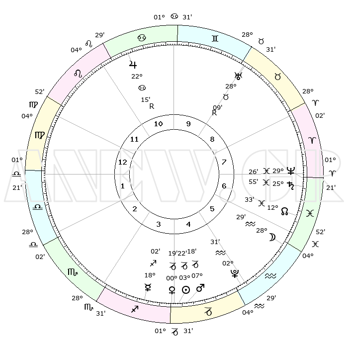| | ΘΕΣΕΙΣ ΠΛΑΝΗΤΩΝ ΑΣΤΡΟΛΟΓΙΚΟΥ ΧΑΡΤΗ ΤΗΣ ΣΤΙΓΜΗΣ ΑΥΤΗΣ | | | | Πλανήτης | Ζώδιο | Μοίρες | Δεκαήμ. | Σε οίκο | Απόκλιση | | Ακμές των οίκων | | Ηλιος | Αιγόκερως | 03°18' | Πρώτο | 4 | 23 S 23 | | 1ος | 12°44' | Παρθένος | | Σελήνη | Υδροχόος | 27°40' | Τρίτο | 6 | 13 S 24 | | 2ος | 07°53' | Ζυγός | | Ερμής | Τοξότης | 17°56' | Δεύτερο | 4 | 22 S 37 | | 3ος | 07°30' | Σκορπιός | | Αφροδίτη | Αιγόκερως | 00°14' | Πρώτο | 4 | 23 S 40 | | 4ος | 10°27' | Τοξότης | | Αρης | Αιγόκερως | 07°15' | Πρώτο | 4 | 24 S 05 | | 5ος | 13°54' | Αιγόκερως | | Δίας | Καρκίνος | 22°15'R | Τρίτο | 11 | 21 N 49 | | 6ος | 15°03' | Υδροχόος | | Κρόνος | Ιχθείς | 25°55' | Τρίτο | 7 | 03 S 43 | | 7ος | 12°44' | Ιχθείς | | Ουρανός | Ταύρος | 28°09'R | Τρίτο | 9 | 19 N 33 | | 8ος | 07°53' | Κριός | | Ποσειδώνας | Ιχθείς | 29°26' | Τρίτο | 7 | 01 S 27 | | 9ος | 07°30' | Ταύρος | | Πλούτωνας | Υδροχόος | 02°31' | Πρώτο | 5 | 23 S 16 | | 10ος | 10°27' | Δίδυμοι | | Β. Δεσμός | Ιχθείς | 12°33' | Δεύτερο | 6 | 06 S 51 | | 11ος | 13°54' | Καρκίνος | | Ωροσκόπος | Παρθένος | 12°44' | Δεύτερο | | | 12ος | 15°03' | Λέων | | Μεσουράνημα | Δίδυμοι | 10°27' | Δεύτερο | | | |