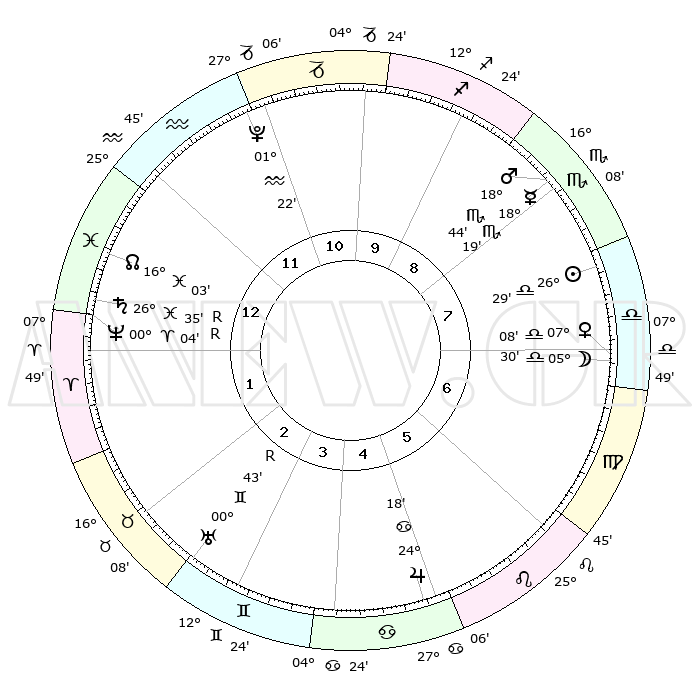 | ΘΕΣΕΙΣ ΠΛΑΝΗΤΩΝ ΑΣΤΡΟΛΟΓΙΚΟΥ ΧΑΡΤΗ ΤΗΣ ΣΤΙΓΜΗΣ ΑΥΤΗΣ | | Πλανήτης | Ζώδιο | Μοίρες | Δεκαήμ. | Σε οίκο | Απόκλιση | | Ακμές των οίκων | Ηλιος | Ζυγός | 26°22' | Τρίτο | 8 | 10 S 10 | | 1ος | 09°21' | Υδροχόος | Σελήνη | Ζυγός | 04°12' | Πρώτο | 8 | 03 S 00 | | 2ος | 24°40' | Ιχθείς | Ερμής | Σκορπιός | 18°11' | Δεύτερο | 9 | 19 S 20 | | 3ος | 01°29' | Ταύρος | Αφροδίτη | Ζυγός | 06°60' | Πρώτο | 8 | 01 S 22 | | 4ος | 28°26' | Ταύρος | Αρης | Σκορπιός | 18°39' | Δεύτερο | 9 | 17 S 38 | | 5ος | 20°38' | Δίδυμοι | Δίας | Καρκίνος | 24°17' | Τρίτο | 6 | 21 N 19 | | 6ος | 12°29' | Καρκίνος | Κρόνος | Ιχθείς | 26°36'R | Τρίτο | 2 | 03 S 38 | | 7ος | 09°21' | Λέων | Ουρανός | Δίδυμοι | 00°43'R | Πρώτο | 4 | 20 N 05 | | 8ος | 24°40' | Παρθένος | Ποσειδώνας | Κριός | 00°04'R | Πρώτο | 2 | 01 S 14 | | 9ος | 01°28' | Σκορπιός | Πλούτωνας | Υδροχόος | 01°22' | Πρώτο | 12 | 23 S 32 | | 10ος | 28°26' | Σκορπιός | Β. Δεσμός | Ιχθείς | 16°04' | Δεύτερο | 1 | 05 S 30 | | 11ος | 20°38' | Τοξότης | Ωροσκόπος | Υδροχόος | 09°21' | Πρώτο | | | 12ος | 12°29' | Αιγόκερως | Μεσουράνημα | Σκορπιός | 28°26' | Τρίτο | | | |