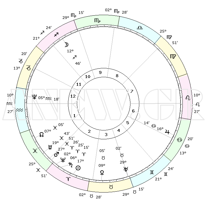 | | ΘΕΣΕΙΣ ΠΛΑΝΗΤΩΝ ΑΣΤΡΟΛΟΓΙΚΟΥ ΧΑΡΤΗ ΤΗΣ ΣΤΙΓΜΗΣ ΑΥΤΗΣ | | | | Πλανήτης | Ζώδιο | Μοίρες | Δεκαήμ. | Σε οίκο | Απόκλιση | | Ακμές των οίκων | | Ηλιος | Κριός | 17°11' | Δεύτερο | 3 | 06 N 45 | | 1ος | 12°28' | Αιγόκερως | | Σελήνη | Τοξότης | 11°57' | Δεύτερο | 11 | 27 S 19 | | 2ος | 22°48' | Υδροχόος | | Ερμής | Ιχθείς | 19°38' | Δεύτερο | 2 | 06 S 01 | | 3ος | 03°02' | Κριός | | Αφροδίτη | Ταύρος | 09°00' | Πρώτο | 4 | 14 N 19 | | 4ος | 04°45' | Ταύρος | | Αρης | Ιχθείς | 27°48' | Τρίτο | 2 | 01 S 49 | | 5ος | 29°16' | Ταύρος | | Δίας | Καρκίνος | 16°13' | Δεύτερο | 7 | 22 N 49 | | 6ος | 20°32' | Δίδυμοι | | Κρόνος | Κριός | 06°24' | Πρώτο | 3 | 00 N 35 | | 7ος | 12°28' | Καρκίνος | | Ουρανός | Ταύρος | 29°02' | Τρίτο | 4 | 19 N 46 | | 8ος | 22°48' | Λέων | | Ποσειδώνας | Κριός | 02°26' | Πρώτο | 2 | 00 S 14 | | 9ος | 03°02' | Ζυγός | | Πλούτωνας | Υδροχόος | 05°18' | Πρώτο | 1 | 22 S 47 | | 10ος | 04°45' | Σκορπιός | | Β. Δεσμός | Ιχθείς | 07°05' | Πρώτο | 2 | 08 S 54 | | 11ος | 29°16' | Σκορπιός | | Ωροσκόπος | Αιγόκερως | 12°28' | Δεύτερο | | | 12ος | 20°32' | Τοξότης | | Μεσουράνημα | Σκορπιός | 04°45' | Πρώτο | | | |
