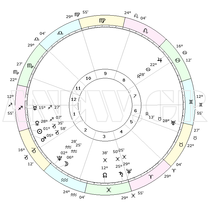 | | ΘΕΣΕΙΣ ΠΛΑΝΗΤΩΝ ΑΣΤΡΟΛΟΓΙΚΟΥ ΧΑΡΤΗ ΤΗΣ ΣΤΙΓΜΗΣ ΑΥΤΗΣ | | | | Πλανήτης | Ζώδιο | Μοίρες | Δεκαήμ. | Σε οίκο | Απόκλιση | | Ακμές των οίκων | | Ηλιος | Αιγόκερως | 01°25' | Πρώτο | 3 | 23 S 26 | | 1ος | 26°40' | Ζυγός | | Σελήνη | Υδροχόος | 04°27' | Πρώτο | 4 | 22 S 05 | | 2ος | 24°53' | Σκορπιός | | Ερμής | Τοξότης | 15°13' | Δεύτερο | 2 | 22 S 07 | | 3ος | 26°36' | Τοξότης | | Αφροδίτη | Τοξότης | 27°55' | Τρίτο | 3 | 23 S 34 | | 4ος | 00°34' | Υδροχόος | | Αρης | Αιγόκερως | 05°51' | Πρώτο | 3 | 24 S 08 | | 5ος | 03°31' | Ιχθείς | | Δίας | Καρκίνος | 22°29'R | Τρίτο | 9 | 21 N 46 | | 6ος | 02°28' | Κριός | | Κρόνος | Ιχθείς | 25°50' | Τρίτο | 5 | 03 S 46 | | 7ος | 26°40' | Κριός | | Ουρανός | Ταύρος | 28°13'R | Τρίτο | 8 | 19 N 34 | | 8ος | 24°53' | Ταύρος | | Ποσειδώνας | Ιχθείς | 29°25' | Τρίτο | 5 | 01 S 28 | | 9ος | 26°36' | Δίδυμοι | | Πλούτωνας | Υδροχόος | 02°28' | Πρώτο | 4 | 23 S 16 | | 10ος | 00°34' | Λέων | | Β. Δεσμός | Ιχθείς | 12°39' | Δεύτερο | 5 | 06 S 49 | | 11ος | 03°31' | Παρθένος | | Ωροσκόπος | Ζυγός | 26°40' | Τρίτο | | | 12ος | 02°28' | Ζυγός | | Μεσουράνημα | Λέων | 00°34' | Πρώτο | | | |