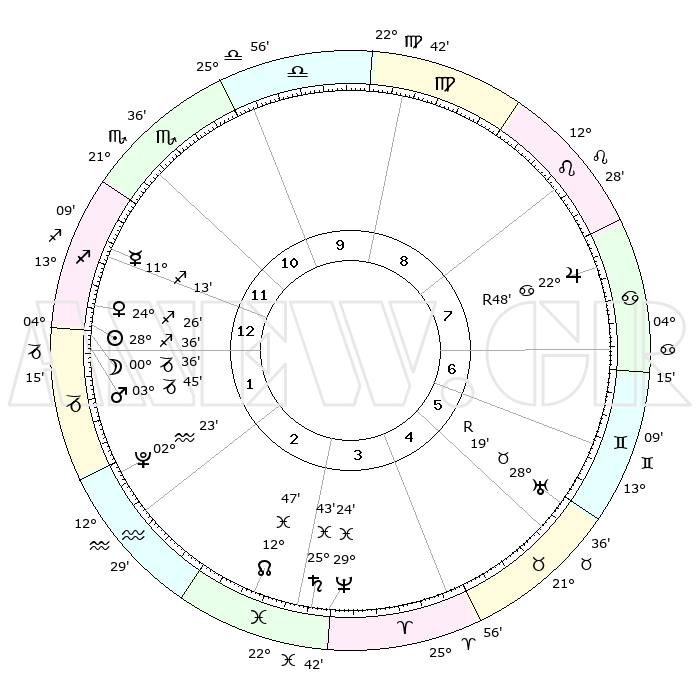 | | ΘΕΣΕΙΣ ΠΛΑΝΗΤΩΝ ΑΣΤΡΟΛΟΓΙΚΟΥ ΧΑΡΤΗ ΤΗΣ ΣΤΙΓΜΗΣ ΑΥΤΗΣ | | | | Πλανήτης | Ζώδιο | Μοίρες | Δεκαήμ. | Σε οίκο | Απόκλιση | | Ακμές των οίκων | | Ηλιος | Τοξότης | 28°31' | Τρίτο | 1 | 23 S 25 | | 1ος | 09°50' | Τοξότης | | Σελήνη | Τοξότης | 29°40' | Τρίτο | 1 | 28 S 12 | | 2ος | 12°31' | Αιγόκερως | | Ερμής | Τοξότης | 11°07' | Δεύτερο | 1 | 21 S 14 | | 3ος | 19°53' | Υδροχόος | | Αφροδίτη | Τοξότης | 24°20' | Τρίτο | 1 | 23 S 21 | | 4ος | 25°53' | Ιχθείς | | Αρης | Αιγόκερως | 03°41' | Πρώτο | 1 | 24 S 12 | | 5ος | 25°31' | Κριός | | Δίας | Καρκίνος | 22°48'R | Τρίτο | 8 | 21 N 43 | | 6ος | 19°17' | Ταύρος | | Κρόνος | Ιχθείς | 25°43' | Τρίτο | 3 | 03 S 49 | | 7ος | 09°50' | Δίδυμοι | | Ουρανός | Ταύρος | 28°19'R | Τρίτο | 6 | 19 N 35 | | 8ος | 12°31' | Καρκίνος | | Ποσειδώνας | Ιχθείς | 29°24' | Τρίτο | 4 | 01 S 28 | | 9ος | 19°53' | Λέων | | Πλούτωνας | Υδροχόος | 02°23' | Πρώτο | 2 | 23 S 18 | | 10ος | 25°53' | Παρθένος | | Β. Δεσμός | Ιχθείς | 12°48' | Δεύτερο | 3 | 06 S 45 | | 11ος | 25°31' | Ζυγός | | Ωροσκόπος | Τοξότης | 09°50' | Πρώτο | | | 12ος | 19°17' | Σκορπιός | | Μεσουράνημα | Παρθένος | 25°53' | Τρίτο | | | |