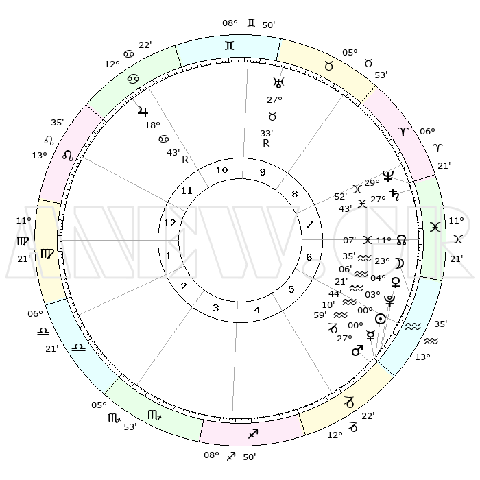 | | ΘΕΣΕΙΣ ΠΛΑΝΗΤΩΝ ΑΣΤΡΟΛΟΓΙΚΟΥ ΧΑΡΤΗ ΤΗΣ ΣΤΙΓΜΗΣ ΑΥΤΗΣ | | | | Πλανήτης | Ζώδιο | Μοίρες | Δεκαήμ. | Σε οίκο | Απόκλιση | | Ακμές των οίκων | | Ηλιος | Υδροχόος | 00°37' | Πρώτο | 6 | 20 S 01 | | 1ος | 09°27' | Λέων | | Σελήνη | Υδροχόος | 22°10' | Τρίτο | 7 | 15 S 34 | | 2ος | 01°14' | Παρθένος | | Ερμής | Αιγόκερως | 29°59' | Τρίτο | 6 | 22 S 08 | | 3ος | 27°34' | Παρθένος | | Αφροδίτη | Υδροχόος | 03°58' | Πρώτο | 6 | 20 S 22 | | 4ος | 29°35' | Ζυγός | | Αρης | Αιγόκερως | 27°54' | Τρίτο | 6 | 21 S 33 | | 5ος | 05°13' | Τοξότης | | Δίας | Καρκίνος | 18°44'R | Δεύτερο | 12 | 22 N 24 | | 6ος | 09°27' | Αιγόκερως | | Κρόνος | Ιχθείς | 27°43' | Τρίτο | 9 | 02 S 56 | | 7ος | 09°27' | Υδροχόος | | Ουρανός | Ταύρος | 27°33'R | Τρίτο | 10 | 19 N 25 | | 8ος | 01°14' | Ιχθείς | | Ποσειδώνας | Ιχθείς | 29°51' | Τρίτο | 9 | 01 S 16 | | 9ος | 27°34' | Ιχθείς | | Πλούτωνας | Υδροχόος | 03°20' | Πρώτο | 6 | 23 S 06 | | 10ος | 29°35' | Κριός | | Β. Δεσμός | Ιχθείς | 11°08' | Δεύτερο | 8 | 07 S 23 | | 11ος | 05°13' | Δίδυμοι | | Ωροσκόπος | Λέων | 09°27' | Πρώτο | | | 12ος | 09°27' | Καρκίνος | | Μεσουράνημα | Κριός | 29°35' | Τρίτο | | | |