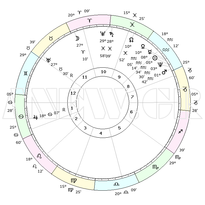 | | ΘΕΣΕΙΣ ΠΛΑΝΗΤΩΝ ΑΣΤΡΟΛΟΓΙΚΟΥ ΧΑΡΤΗ ΤΗΣ ΣΤΙΓΜΗΣ ΑΥΤΗΣ | | | | Πλανήτης | Ζώδιο | Μοίρες | Δεκαήμ. | Σε οίκο | Απόκλιση | | Ακμές των οίκων | | Ηλιος | Υδροχόος | 05°29' | Πρώτο | 9 | 18 S 54 | | 1ος | 05°15' | Δίδυμοι | | Σελήνη | Κριός | 25°59' | Τρίτο | 12 | 13 N 34 | | 2ος | 29°04' | Δίδυμοι | | Ερμής | Υδροχόος | 08°06' | Πρώτο | 9 | 20 S 15 | | 3ος | 20°20' | Καρκίνος | | Αφροδίτη | Υδροχόος | 09°59' | Πρώτο | 9 | 18 S 56 | | 4ος | 13°31' | Λέων | | Αρης | Υδροχόος | 01°38' | Πρώτο | 9 | 20 S 47 | | 5ος | 12°55' | Παρθένος | | Δίας | Καρκίνος | 18°07'R | Δεύτερο | 2 | 22 N 30 | | 6ος | 22°07' | Ζυγός | | Κρόνος | Ιχθείς | 28°08' | Τρίτο | 11 | 02 S 45 | | 7ος | 05°15' | Τοξότης | | Ουρανός | Ταύρος | 27°30'R | Τρίτο | 12 | 19 N 25 | | 8ος | 29°04' | Τοξότης | | Ποσειδώνας | Ιχθείς | 29°58' | Τρίτο | 11 | 01 S 13 | | 9ος | 20°20' | Αιγόκερως | | Πλούτωνας | Υδροχόος | 03°30' | Πρώτο | 9 | 23 S 04 | | 10ος | 13°31' | Υδροχόος | | Β. Δεσμός | Ιχθείς | 10°52' | Δεύτερο | 10 | 07 S 29 | | 11ος | 12°55' | Ιχθείς | | Ωροσκόπος | Δίδυμοι | 05°15' | Πρώτο | | | 12ος | 22°07' | Κριός | | Μεσουράνημα | Υδροχόος | 13°31' | Δεύτερο | | | |