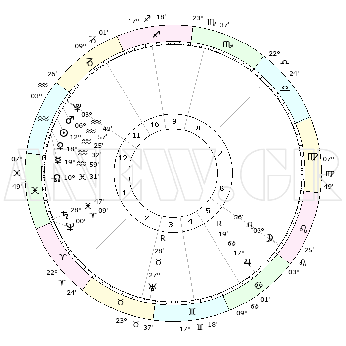 | | ΘΕΣΕΙΣ ΠΛΑΝΗΤΩΝ ΑΣΤΡΟΛΟΓΙΚΟΥ ΧΑΡΤΗ ΤΗΣ ΣΤΙΓΜΗΣ ΑΥΤΗΣ | | | | Πλανήτης | Ζώδιο | Μοίρες | Δεκαήμ. | Σε οίκο | Απόκλιση | | Ακμές των οίκων | | Ηλιος | Υδροχόος | 12°21' | Δεύτερο | 1 | 17 S 06 | | 1ος | 03°40' | Υδροχόος | | Σελήνη | Λέων | 02°58' | Πρώτο | 6 | 22 N 29 | | 2ος | 18°19' | Ιχθείς | | Ερμής | Υδροχόος | 19°52' | Δεύτερο | 1 | 16 S 38 | | 3ος | 26°10' | Κριός | | Αφροδίτη | Υδροχόος | 18°27' | Δεύτερο | 1 | 16 S 35 | | 4ος | 24°01' | Ταύρος | | Αρης | Υδροχόος | 06°54' | Πρώτο | 1 | 19 S 33 | | 5ος | 16°31' | Δίδυμοι | | Δίας | Καρκίνος | 17°20'R | Δεύτερο | 6 | 22 N 37 | | 6ος | 08°05' | Καρκίνος | | Κρόνος | Ιχθείς | 28°47' | Τρίτο | 2 | 02 S 29 | | 7ος | 03°40' | Λέων | | Ουρανός | Ταύρος | 27°28'R | Τρίτο | 4 | 19 N 24 | | 8ος | 18°19' | Παρθένος | | Ποσειδώνας | Κριός | 00°09' | Πρώτο | 2 | 01 S 09 | | 9ος | 26°10' | Ζυγός | | Πλούτωνας | Υδροχόος | 03°42' | Πρώτο | 1 | 23 S 01 | | 10ος | 24°01' | Σκορπιός | | Β. Δεσμός | Ιχθείς | 10°31' | Δεύτερο | 1 | 07 S 37 | | 11ος | 16°31' | Τοξότης | | Ωροσκόπος | Υδροχόος | 03°40' | Πρώτο | | | 12ος | 08°05' | Αιγόκερως | | Μεσουράνημα | Σκορπιός | 24°01' | Τρίτο | | | |