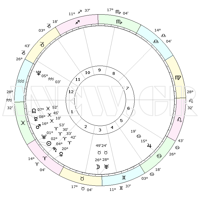 | | ΘΕΣΕΙΣ ΠΛΑΝΗΤΩΝ ΑΣΤΡΟΛΟΓΙΚΟΥ ΧΑΡΤΗ ΤΗΣ ΣΤΙΓΜΗΣ ΑΥΤΗΣ | | | | Πλανήτης | Ζώδιο | Μοίρες | Δεκαήμ. | Σε οίκο | Απόκλιση | | Ακμές των οίκων | | Ηλιος | Κριός | 02°25' | Πρώτο | 2 | 00 N 58 | | 1ος | 22°14' | Αιγόκερως | | Σελήνη | Ταύρος | 25°41' | Τρίτο | 4 | 24 N 07 | | 2ος | 04°51' | Ιχθείς | | Ερμής | Ιχθείς | 08°44' | Πρώτο | 2 | 07 S 52 | | 3ος | 14°21' | Κριός | | Αφροδίτη | Κριός | 20°36' | Τρίτο | 3 | 07 N 19 | | 4ος | 14°13' | Ταύρος | | Αρης | Ιχθείς | 16°07' | Δεύτερο | 2 | 06 S 28 | | 5ος | 07°38' | Δίδυμοι | | Δίας | Καρκίνος | 15°19' | Δεύτερο | 6 | 22 N 55 | | 6ος | 28°52' | Δίδυμοι | | Κρόνος | Κριός | 04°33' | Πρώτο | 2 | 00 S 09 | | 7ος | 22°14' | Καρκίνος | | Ουρανός | Ταύρος | 28°24' | Τρίτο | 4 | 19 N 38 | | 8ος | 04°51' | Παρθένος | | Ποσειδώνας | Κριός | 01°52' | Πρώτο | 2 | 00 S 27 | | 9ος | 14°21' | Ζυγός | | Πλούτωνας | Υδροχόος | 05°03' | Πρώτο | 1 | 22 S 48 | | 10ος | 14°13' | Σκορπιός | | Β. Δεσμός | Ιχθείς | 07°53' | Πρώτο | 2 | 08 S 37 | | 11ος | 07°38' | Τοξότης | | Ωροσκόπος | Αιγόκερως | 22°14' | Τρίτο | | | 12ος | 28°52' | Τοξότης | | Μεσουράνημα | Σκορπιός | 14°13' | Δεύτερο | | | |