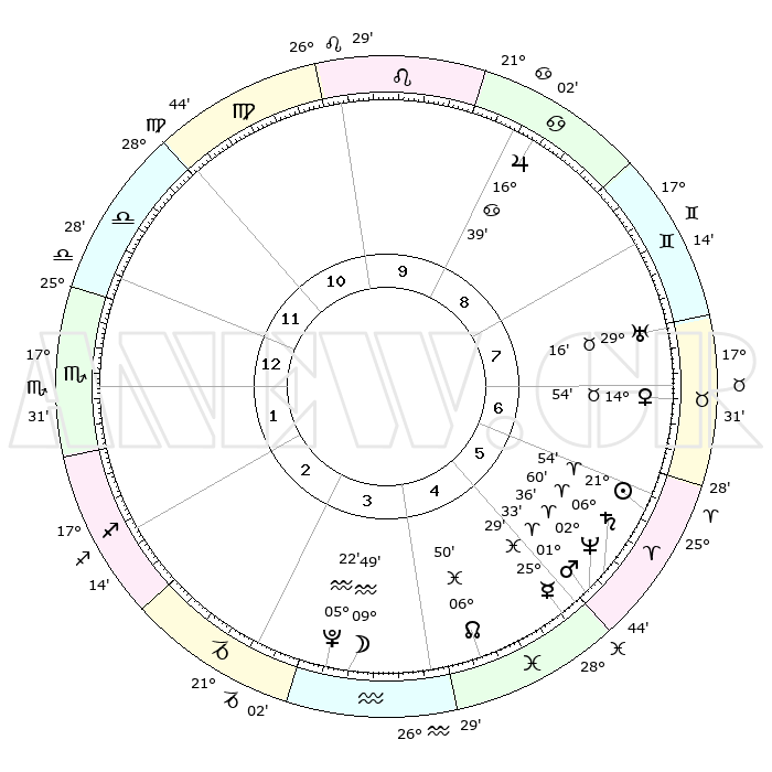 | | ΘΕΣΕΙΣ ΠΛΑΝΗΤΩΝ ΑΣΤΡΟΛΟΓΙΚΟΥ ΧΑΡΤΗ ΤΗΣ ΣΤΙΓΜΗΣ ΑΥΤΗΣ | | | | Πλανήτης | Ζώδιο | Μοίρες | Δεκαήμ. | Σε οίκο | Απόκλιση | | Ακμές των οίκων | | Ηλιος | Κριός | 21°51' | Τρίτο | 6 | 08 N 30 | | 1ος | 28°60' | Ζυγός | | Σελήνη | Υδροχόος | 09°01' | Πρώτο | 4 | 20 S 25 | | 2ος | 27°21' | Σκορπιός | | Ερμής | Ιχθείς | 25°24' | Τρίτο | 5 | 04 S 05 | | 3ος | 29°14' | Τοξότης | | Αφροδίτη | Ταύρος | 14°49' | Δεύτερο | 7 | 16 N 18 | | 4ος | 03°21' | Υδροχόος | | Αρης | Κριός | 01°30' | Πρώτο | 5 | 00 S 19 | | 5ος | 06°17' | Ιχθείς | | Δίας | Καρκίνος | 16°39' | Δεύτερο | 9 | 22 N 46 | | 6ος | 05°02' | Κριός | | Κρόνος | Κριός | 06°59' | Πρώτο | 6 | 00 N 48 | | 7ος | 28°60' | Κριός | | Ουρανός | Ταύρος | 29°16' | Τρίτο | 8 | 19 N 49 | | 8ος | 27°21' | Ταύρος | | Ποσειδώνας | Κριός | 02°36' | Πρώτο | 5 | 00 S 10 | | 9ος | 29°14' | Δίδυμοι | | Πλούτωνας | Υδροχόος | 05°22' | Πρώτο | 4 | 22 S 47 | | 10ος | 03°21' | Λέων | | Β. Δεσμός | Ιχθείς | 06°50' | Πρώτο | 5 | 09 S 00 | | 11ος | 06°17' | Παρθένος | | Ωροσκόπος | Ζυγός | 28°60' | Τρίτο | | | 12ος | 05°02' | Ζυγός | | Μεσουράνημα | Λέων | 03°21' | Πρώτο | | | |