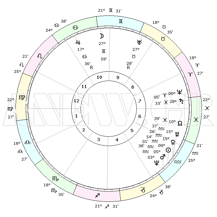 | | ΘΕΣΕΙΣ ΠΛΑΝΗΤΩΝ ΑΣΤΡΟΛΟΓΙΚΟΥ ΧΑΡΤΗ ΤΗΣ ΣΤΙΓΜΗΣ ΑΥΤΗΣ | | | | Πλανήτης | Ζώδιο | Μοίρες | Δεκαήμ. | Σε οίκο | Απόκλιση | | Ακμές των οίκων | | Ηλιος | Υδροχόος | 09°50' | Πρώτο | 6 | 17 S 47 | | 1ος | 02°42' | Παρθένος | | Σελήνη | Δίδυμοι | 27°00' | Τρίτο | 10 | 28 N 21 | | 2ος | 26°50' | Παρθένος | | Ερμής | Υδροχόος | 15°30' | Δεύτερο | 6 | 18 S 05 | | 3ος | 25°44' | Ζυγός | | Αφροδίτη | Υδροχόος | 15°21' | Δεύτερο | 6 | 17 S 30 | | 4ος | 28°41' | Σκορπιός | | Αρης | Υδροχόος | 04°58' | Πρώτο | 6 | 20 S 01 | | 5ος | 02°41' | Αιγόκερως | | Δίας | Καρκίνος | 17°37'R | Δεύτερο | 11 | 22 N 34 | | 6ος | 04°26' | Υδροχόος | | Κρόνος | Ιχθείς | 28°32' | Τρίτο | 8 | 02 S 35 | | 7ος | 02°42' | Ιχθείς | | Ουρανός | Ταύρος | 27°28'R | Τρίτο | 9 | 19 N 24 | | 8ος | 26°50' | Ιχθείς | | Ποσειδώνας | Κριός | 00°05' | Πρώτο | 8 | 01 S 11 | | 9ος | 25°44' | Κριός | | Πλούτωνας | Υδροχόος | 03°38' | Πρώτο | 5 | 23 S 02 | | 10ος | 28°40' | Ταύρος | | Β. Δεσμός | Ιχθείς | 10°39' | Δεύτερο | 7 | 07 S 34 | | 11ος | 02°41' | Καρκίνος | | Ωροσκόπος | Παρθένος | 02°42' | Πρώτο | | | 12ος | 04°26' | Λέων | | Μεσουράνημα | Ταύρος | 28°40' | Τρίτο | | | |