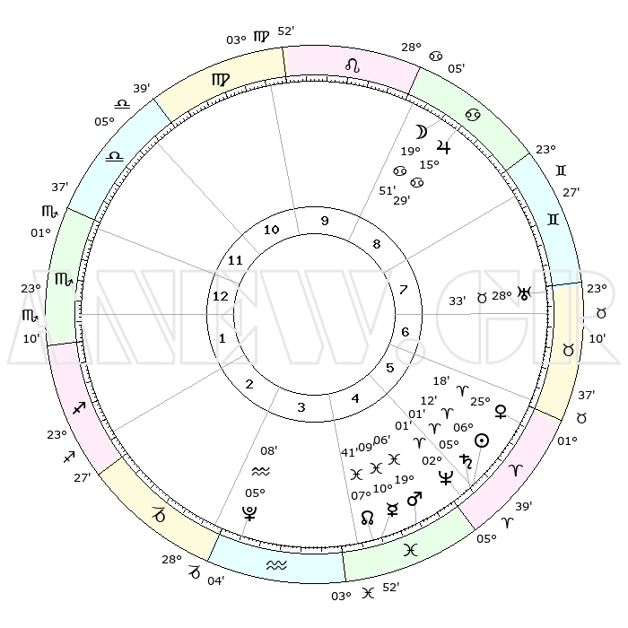 | | ΘΕΣΕΙΣ ΠΛΑΝΗΤΩΝ ΑΣΤΡΟΛΟΓΙΚΟΥ ΧΑΡΤΗ ΤΗΣ ΣΤΙΓΜΗΣ ΑΥΤΗΣ | | | | Πλανήτης | Ζώδιο | Μοίρες | Δεκαήμ. | Σε οίκο | Απόκλιση | | Ακμές των οίκων | | Ηλιος | Κριός | 06°08' | Πρώτο | 5 | 02 N 26 | | 1ος | 04°04' | Σκορπιός | | Σελήνη | Καρκίνος | 18°56' | Δεύτερο | 9 | 26 N 03 | | 2ος | 02°44' | Τοξότης | | Ερμής | Ιχθείς | 10°07' | Δεύτερο | 4 | 08 S 07 | | 3ος | 05°02' | Αιγόκερως | | Αφροδίτη | Κριός | 25°14' | Τρίτο | 6 | 09 N 09 | | 4ος | 09°30' | Υδροχόος | | Αρης | Ιχθείς | 19°03' | Δεύτερο | 5 | 05 S 19 | | 5ος | 12°21' | Ιχθείς | | Δίας | Καρκίνος | 15°29' | Δεύτερο | 9 | 22 N 54 | | 6ος | 10°38' | Κριός | | Κρόνος | Κριός | 05°01' | Πρώτο | 5 | 00 N 02 | | 7ος | 04°04' | Ταύρος | | Ουρανός | Ταύρος | 28°33' | Τρίτο | 7 | 19 N 40 | | 8ος | 02°44' | Δίδυμοι | | Ποσειδώνας | Κριός | 02°01' | Πρώτο | 5 | 00 S 24 | | 9ος | 05°02' | Καρκίνος | | Πλούτωνας | Υδροχόος | 05°08' | Πρώτο | 3 | 22 S 48 | | 10ος | 09°30' | Λέων | | Β. Δεσμός | Ιχθείς | 07°41' | Πρώτο | 4 | 08 S 41 | | 11ος | 12°21' | Παρθένος | | Ωροσκόπος | Σκορπιός | 04°04' | Πρώτο | | | 12ος | 10°38' | Ζυγός | | Μεσουράνημα | Λέων | 09°30' | Πρώτο | | | |