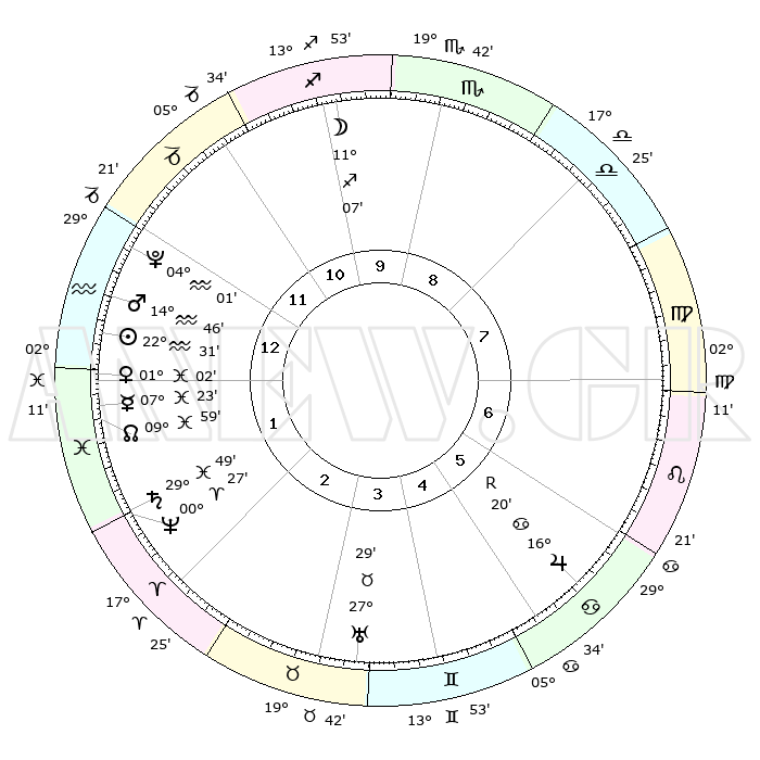 | | ΘΕΣΕΙΣ ΠΛΑΝΗΤΩΝ ΑΣΤΡΟΛΟΓΙΚΟΥ ΧΑΡΤΗ ΤΗΣ ΣΤΙΓΜΗΣ ΑΥΤΗΣ | | | | Πλανήτης | Ζώδιο | Μοίρες | Δεκαήμ. | Σε οίκο | Απόκλιση | | Ακμές των οίκων | | Ηλιος | Υδροχόος | 22°16' | Τρίτο | 3 | 14 S 05 | | 1ος | 03°31' | Τοξότης | | Σελήνη | Τοξότης | 08°21' | Πρώτο | 1 | 26 S 53 | | 2ος | 05°09' | Αιγόκερως | | Ερμής | Ιχθείς | 06°59' | Πρώτο | 3 | 09 S 38 | | 3ος | 11°27' | Υδροχόος | | Αφροδίτη | Ιχθείς | 00°44' | Πρώτο | 3 | 12 S 34 | | 4ος | 17°33' | Ιχθείς | | Αρης | Υδροχόος | 14°35' | Δεύτερο | 3 | 17 S 29 | | 5ος | 18°07' | Κριός | | Δίας | Καρκίνος | 16°21'R | Δεύτερο | 8 | 22 N 45 | | 6ος | 12°42' | Ταύρος | | Κρόνος | Ιχθείς | 29°47' | Τρίτο | 4 | 02 S 04 | | 7ος | 03°31' | Δίδυμοι | | Ουρανός | Ταύρος | 27°29' | Τρίτο | 6 | 19 N 25 | | 8ος | 05°09' | Καρκίνος | | Ποσειδώνας | Κριός | 00°26' | Πρώτο | 4 | 01 S 02 | | 9ος | 11°27' | Λέων | | Πλούτωνας | Υδροχόος | 04°01' | Πρώτο | 2 | 22 S 58 | | 10ος | 17°33' | Παρθένος | | Β. Δεσμός | Ιχθείς | 09°60' | Πρώτο | 3 | 07 S 49 | | 11ος | 18°07' | Ζυγός | | Ωροσκόπος | Τοξότης | 03°31' | Πρώτο | | | 12ος | 12°42' | Σκορπιός | | Μεσουράνημα | Παρθένος | 17°33' | Δεύτερο | | | |