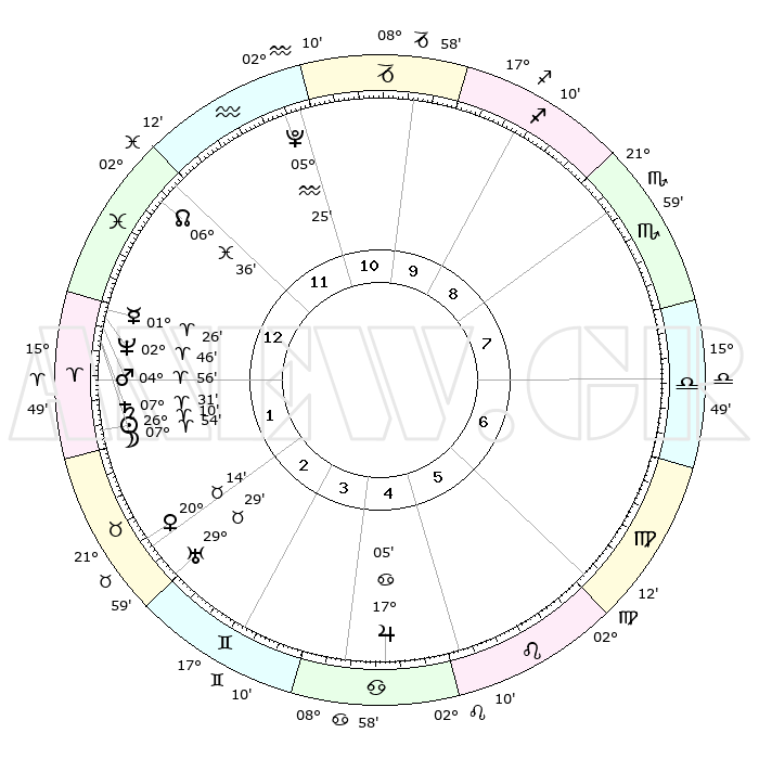 | | ΘΕΣΕΙΣ ΠΛΑΝΗΤΩΝ ΑΣΤΡΟΛΟΓΙΚΟΥ ΧΑΡΤΗ ΤΗΣ ΣΤΙΓΜΗΣ ΑΥΤΗΣ | | | | Πλανήτης | Ζώδιο | Μοίρες | Δεκαήμ. | Σε οίκο | Απόκλιση | | Ακμές των οίκων | | Ηλιος | Κριός | 26°07' | Τρίτο | 2 | 10 N 05 | | 1ος | 10°09' | Ιχθείς | | Σελήνη | Κριός | 07°01' | Πρώτο | 1 | 05 N 04 | | 2ος | 24°25' | Κριός | | Ερμής | Κριός | 01°21' | Πρώτο | 1 | 01 S 52 | | 3ος | 25°11' | Ταύρος | | Αφροδίτη | Ταύρος | 20°09' | Τρίτο | 2 | 17 N 59 | | 4ος | 18°41' | Δίδυμοι | | Αρης | Κριός | 04°53' | Πρώτο | 1 | 01 N 02 | | 5ος | 10°25' | Καρκίνος | | Δίας | Καρκίνος | 17°05' | Δεύτερο | 5 | 22 N 43 | | 6ος | 05°06' | Λέων | | Κρόνος | Κριός | 07°31' | Πρώτο | 1 | 01 N 01 | | 7ος | 10°09' | Παρθένος | | Ουρανός | Ταύρος | 29°29' | Τρίτο | 3 | 19 N 52 | | 8ος | 24°25' | Ζυγός | | Ποσειδώνας | Κριός | 02°46' | Πρώτο | 1 | 00 S 06 | | 9ος | 25°11' | Σκορπιός | | Πλούτωνας | Υδροχόος | 05°25' | Πρώτο | 12 | 22 S 47 | | 10ος | 18°41' | Τοξότης | | Β. Δεσμός | Ιχθείς | 06°36' | Πρώτο | 12 | 09 S 05 | | 11ος | 10°25' | Αιγόκερως | | Ωροσκόπος | Ιχθείς | 10°09' | Δεύτερο | | | 12ος | 05°06' | Υδροχόος | | Μεσουράνημα | Τοξότης | 18°41' | Δεύτερο | | | |