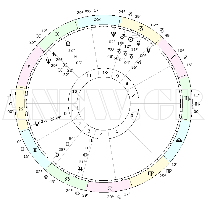 | | ΘΕΣΕΙΣ ΠΛΑΝΗΤΩΝ ΑΣΤΡΟΛΟΓΙΚΟΥ ΧΑΡΤΗ ΤΗΣ ΣΤΙΓΜΗΣ ΑΥΤΗΣ | | | | Πλανήτης | Ζώδιο | Μοίρες | Δεκαήμ. | Σε οίκο | Απόκλιση | | Ακμές των οίκων | | Ηλιος | Αιγόκερως | 11°60' | Δεύτερο | 10 | 22 S 53 | | 1ος | 29°36' | Ιχθείς | | Σελήνη | Δίδυμοι | 27°47' | Τρίτο | 3 | 28 N 16 | | 2ος | 09°59' | Ταύρος | | Ερμής | Αιγόκερως | 00°48' | Πρώτο | 10 | 24 S 09 | | 3ος | 07°27' | Δίδυμοι | | Αφροδίτη | Αιγόκερως | 10°59' | Δεύτερο | 10 | 23 S 32 | | 4ος | 29°46' | Δίδυμοι | | Αρης | Αιγόκερως | 13°46' | Δεύτερο | 10 | 23 S 37 | | 5ος | 22°04' | Καρκίνος | | Δίας | Καρκίνος | 21°10'R | Τρίτο | 4 | 22 N 00 | | 6ος | 19°24' | Λέων | | Κρόνος | Ιχθείς | 26°22' | Τρίτο | 12 | 03 S 31 | | 7ος | 29°36' | Παρθένος | | Ουρανός | Ταύρος | 27°54'R | Τρίτο | 2 | 19 N 30 | | 8ος | 09°59' | Σκορπιός | | Ποσειδώνας | Ιχθείς | 29°32' | Τρίτο | 12 | 01 S 25 | | 9ος | 07°27' | Τοξότης | | Πλούτωνας | Υδροχόος | 02°46' | Πρώτο | 11 | 23 S 13 | | 10ος | 29°46' | Τοξότης | | Β. Δεσμός | Ιχθείς | 12°06' | Δεύτερο | 12 | 07 S 01 | | 11ος | 22°04' | Αιγόκερως | | Ωροσκόπος | Ιχθείς | 29°36' | Τρίτο | | | 12ος | 19°24' | Υδροχόος | | Μεσουράνημα | Τοξότης | 29°46' | Τρίτο | | | |