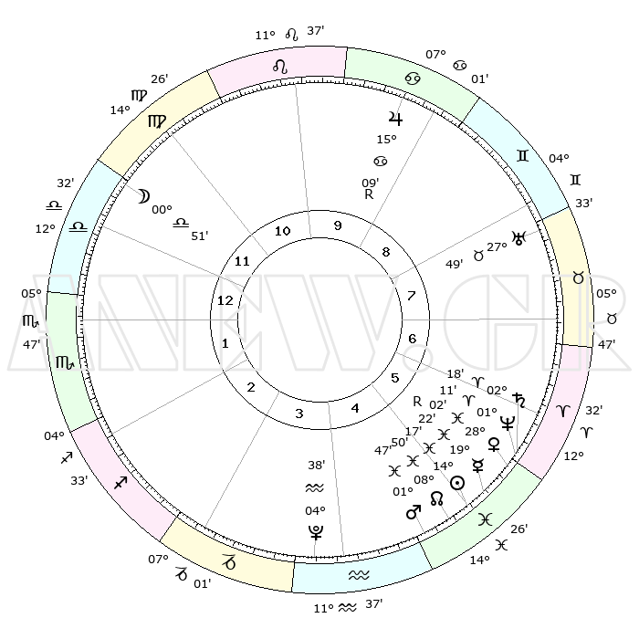 | | ΘΕΣΕΙΣ ΠΛΑΝΗΤΩΝ ΑΣΤΡΟΛΟΓΙΚΟΥ ΧΑΡΤΗ ΤΗΣ ΣΤΙΓΜΗΣ ΑΥΤΗΣ | | | | Πλανήτης | Ζώδιο | Μοίρες | Δεκαήμ. | Σε οίκο | Απόκλιση | | Ακμές των οίκων | | Ηλιος | Ιχθείς | 14°13' | Δεύτερο | 5 | 06 S 12 | | 1ος | 19°47' | Ζυγός | | Σελήνη | Ζυγός | 00°09' | Πρώτο | 12 | 01 S 49 | | 2ος | 17°37' | Σκορπιός | | Ερμής | Ιχθείς | 19°25'R | Δεύτερο | 5 | 00 S 49 | | 3ος | 18°54' | Τοξότης | | Αφροδίτη | Ιχθείς | 27°57' | Τρίτο | 6 | 02 S 00 | | 4ος | 22°29' | Αιγόκερως | | Αρης | Ιχθείς | 01°45' | Πρώτο | 5 | 11 S 52 | | 5ος | 25°26' | Υδροχόος | | Δίας | Καρκίνος | 15°09'R | Δεύτερο | 9 | 22 N 55 | | 6ος | 24°54' | Ιχθείς | | Κρόνος | Κριός | 02°18' | Πρώτο | 6 | 01 S 03 | | 7ος | 19°47' | Κριός | | Ουρανός | Ταύρος | 27°49' | Τρίτο | 8 | 19 N 30 | | 8ος | 17°37' | Ταύρος | | Ποσειδώνας | Κριός | 01°11' | Πρώτο | 6 | 00 S 44 | | 9ος | 18°54' | Δίδυμοι | | Πλούτωνας | Υδροχόος | 04°38' | Πρώτο | 4 | 22 S 52 | | 10ος | 22°28' | Καρκίνος | | Β. Δεσμός | Ιχθείς | 08°51' | Πρώτο | 5 | 08 S 15 | | 11ος | 25°26' | Λέων | | Ωροσκόπος | Ζυγός | 19°47' | Δεύτερο | | | 12ος | 24°54' | Παρθένος | | Μεσουράνημα | Καρκίνος | 22°28' | Τρίτο | | | |