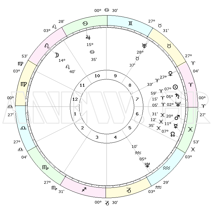 | | ΘΕΣΕΙΣ ΠΛΑΝΗΤΩΝ ΑΣΤΡΟΛΟΓΙΚΟΥ ΧΑΡΤΗ ΤΗΣ ΣΤΙΓΜΗΣ ΑΥΤΗΣ | | | | Πλανήτης | Ζώδιο | Μοίρες | Δεκαήμ. | Σε οίκο | Απόκλιση | | Ακμές των οίκων | | Ηλιος | Κριός | 07°56' | Πρώτο | 8 | 03 N 09 | | 1ος | 12°03' | Παρθένος | | Σελήνη | Λέων | 13°49' | Δεύτερο | 11 | 18 N 47 | | 2ος | 07°07' | Ζυγός | | Ερμής | Ιχθείς | 11°10' | Δεύτερο | 6 | 08 S 03 | | 3ος | 06°42' | Σκορπιός | | Αφροδίτη | Κριός | 27°28' | Τρίτο | 8 | 10 N 02 | | 4ος | 09°39' | Τοξότης | | Αρης | Ιχθείς | 20°28' | Τρίτο | 7 | 04 S 45 | | 5ος | 13°08' | Αιγόκερως | | Δίας | Καρκίνος | 15°35' | Δεύτερο | 11 | 22 N 53 | | 6ος | 14°19' | Υδροχόος | | Κρόνος | Κριός | 05°14' | Πρώτο | 7 | 00 N 08 | | 7ος | 12°03' | Ιχθείς | | Ουρανός | Ταύρος | 28°37' | Τρίτο | 9 | 19 N 41 | | 8ος | 07°07' | Κριός | | Ποσειδώνας | Κριός | 02°05' | Πρώτο | 7 | 00 S 22 | | 9ος | 06°42' | Ταύρος | | Πλούτωνας | Υδροχόος | 05°10' | Πρώτο | 5 | 22 S 48 | | 10ος | 09°39' | Δίδυμοι | | Β. Δεσμός | Ιχθείς | 07°35' | Πρώτο | 6 | 08 S 43 | | 11ος | 13°08' | Καρκίνος | | Ωροσκόπος | Παρθένος | 12°03' | Δεύτερο | | | 12ος | 14°19' | Λέων | | Μεσουράνημα | Δίδυμοι | 09°39' | Πρώτο | | | |