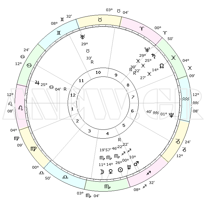| | ΘΕΣΕΙΣ ΠΛΑΝΗΤΩΝ ΑΣΤΡΟΛΟΓΙΚΟΥ ΧΑΡΤΗ ΤΗΣ ΣΤΙΓΜΗΣ ΑΥΤΗΣ | | | | Πλανήτης | Ζώδιο | Μοίρες | Δεκαήμ. | Σε οίκο | Απόκλιση | | Ακμές των οίκων | | Ηλιος | Σκορπιός | 26°42' | Τρίτο | 5 | 19 S 25 | | 1ος | 24°18' | Καρκίνος | | Σελήνη | Σκορπιός | 10°35' | Δεύτερο | 4 | 18 S 53 | | 2ος | 15°01' | Λέων | | Ερμής | Τοξότης | 00°27'R | Πρώτο | 5 | 20 S 15 | | 3ος | 09°18' | Παρθένος | | Αφροδίτη | Σκορπιός | 14°53' | Δεύτερο | 4 | 15 S 14 | | 4ος | 09°34' | Ζυγός | | Αρης | Τοξότης | 10°19' | Δεύτερο | 5 | 22 S 33 | | 5ος | 15°39' | Σκορπιός | | Δίας | Καρκίνος | 25°04'R | Τρίτο | 1 | 21 N 14 | | 6ος | 22°19' | Τοξότης | | Κρόνος | Ιχθείς | 25°22'R | Τρίτο | 9 | 04 S 03 | | 7ος | 24°18' | Αιγόκερως | | Ουρανός | Ταύρος | 29°33'R | Τρίτο | 11 | 19 N 51 | | 8ος | 15°01' | Υδροχόος | | Ποσειδώνας | Ιχθείς | 29°30'R | Τρίτο | 9 | 01 S 27 | | 9ος | 09°18' | Ιχθείς | | Πλούτωνας | Υδροχόος | 01°40' | Πρώτο | 7 | 23 S 27 | | 10ος | 09°34' | Κριός | | Β. Δεσμός | Ιχθείς | 14°27' | Δεύτερο | 9 | 06 S 07 | | 11ος | 15°39' | Ταύρος | | Ωροσκόπος | Καρκίνος | 24°18' | Τρίτο | | | 12ος | 22°19' | Δίδυμοι | | Μεσουράνημα | Κριός | 09°34' | Πρώτο | | | |