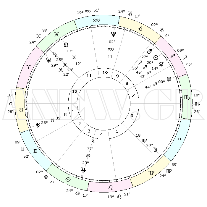 | | ΘΕΣΕΙΣ ΠΛΑΝΗΤΩΝ ΑΣΤΡΟΛΟΓΙΚΟΥ ΧΑΡΤΗ ΤΗΣ ΣΤΙΓΜΗΣ ΑΥΤΗΣ | | | | Πλανήτης | Ζώδιο | Μοίρες | Δεκαήμ. | Σε οίκο | Απόκλιση | | Ακμές των οίκων | | Ηλιος | Τοξότης | 20°40' | Τρίτο | 9 | 23 S 06 | | 1ος | 28°08' | Ιχθείς | | Σελήνη | Παρθένος | 27°22' | Τρίτο | 6 | 00 S 06 | | 2ος | 08°52' | Ταύρος | | Ερμής | Τοξότης | 00°39' | Πρώτο | 8 | 18 S 28 | | 3ος | 06°34' | Δίδυμοι | | Αφροδίτη | Τοξότης | 14°37' | Δεύτερο | 9 | 22 S 17 | | 4ος | 28°57' | Δίδυμοι | | Αρης | Τοξότης | 27°51' | Τρίτο | 9 | 24 S 10 | | 5ος | 21°11' | Καρκίνος | | Δίας | Καρκίνος | 23°37'R | Τρίτο | 5 | 21 N 33 | | 6ος | 18°18' | Λέων | | Κρόνος | Ιχθείς | 25°28' | Τρίτο | 12 | 03 S 56 | | 7ος | 28°08' | Παρθένος | | Ουρανός | Ταύρος | 28°35'R | Τρίτο | 2 | 19 N 39 | | 8ος | 08°52' | Σκορπιός | | Ποσειδώνας | Ιχθείς | 29°22' | Τρίτο | 1 | 01 S 29 | | 9ος | 06°34' | Τοξότης | | Πλούτωνας | Υδροχόος | 02°11' | Πρώτο | 11 | 23 S 20 | | 10ος | 28°57' | Τοξότης | | Β. Δεσμός | Ιχθείς | 13°12' | Δεύτερο | 12 | 06 S 36 | | 11ος | 21°11' | Αιγόκερως | | Ωροσκόπος | Ιχθείς | 28°08' | Τρίτο | | | 12ος | 18°18' | Υδροχόος | | Μεσουράνημα | Τοξότης | 28°57' | Τρίτο | | | |