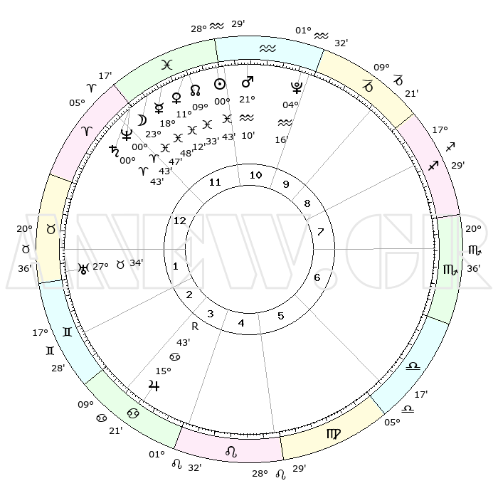 | | ΘΕΣΕΙΣ ΠΛΑΝΗΤΩΝ ΑΣΤΡΟΛΟΓΙΚΟΥ ΧΑΡΤΗ ΤΗΣ ΣΤΙΓΜΗΣ ΑΥΤΗΣ | | | | Πλανήτης | Ζώδιο | Μοίρες | Δεκαήμ. | Σε οίκο | Απόκλιση | | Ακμές των οίκων | | Ηλιος | Ιχθείς | 00°38' | Πρώτο | 12 | 11 S 15 | | 1ος | 10°31' | Κριός | | Σελήνη | Ιχθείς | 22°45' | Τρίτο | 12 | 01 S 43 | | 2ος | 18°07' | Ταύρος | | Ερμής | Ιχθείς | 18°43' | Δεύτερο | 12 | 03 S 29 | | 3ος | 13°60' | Δίδυμοι | | Αφροδίτη | Ιχθείς | 11°06' | Δεύτερο | 12 | 08 S 45 | | 4ος | 05°55' | Καρκίνος | | Αρης | Υδροχόος | 21°06' | Τρίτο | 11 | 15 S 29 | | 5ος | 28°47' | Καρκίνος | | Δίας | Καρκίνος | 15°43'R | Δεύτερο | 4 | 22 N 50 | | 6ος | 27°53' | Λέων | | Κρόνος | Κριός | 00°42' | Πρώτο | 12 | 01 S 41 | | 7ος | 10°31' | Ζυγός | | Ουρανός | Ταύρος | 27°34' | Τρίτο | 2 | 19 N 26 | | 8ος | 18°07' | Σκορπιός | | Ποσειδώνας | Κριός | 00°43' | Πρώτο | 12 | 00 S 55 | | 9ος | 13°60' | Τοξότης | | Πλούτωνας | Υδροχόος | 04°16' | Πρώτο | 11 | 22 S 55 | | 10ος | 05°55' | Αιγόκερως | | Β. Δεσμός | Ιχθείς | 09°34' | Πρώτο | 12 | 07 S 59 | | 11ος | 28°47' | Αιγόκερως | | Ωροσκόπος | Κριός | 10°31' | Δεύτερο | | | 12ος | 27°53' | Υδροχόος | | Μεσουράνημα | Αιγόκερως | 05°55' | Πρώτο | | | |
