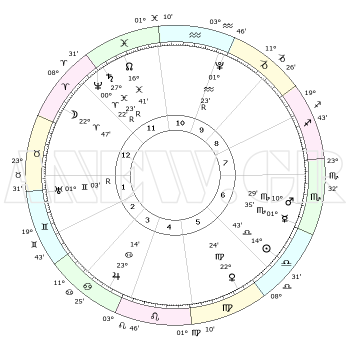 | ΘΕΣΕΙΣ ΠΛΑΝΗΤΩΝ ΑΣΤΡΟΛΟΓΙΚΟΥ ΧΑΡΤΗ ΤΗΣ ΣΤΙΓΜΗΣ ΑΥΤΗΣ | | Πλανήτης | Ζώδιο | Μοίρες | Δεκαήμ. | Σε οίκο | Απόκλιση | | Ακμές των οίκων | Ηλιος | Ζυγός | 14°36' | Δεύτερο | 7 | 05 S 45 | | 1ος | 25°53' | Ιχθείς | Σελήνη | Κριός | 21°11' | Τρίτο | 1 | 10 N 54 | | 2ος | 07°08' | Ταύρος | Ερμής | Σκορπιός | 01°25' | Πρώτο | 7 | 12 S 48 | | 3ος | 05°11' | Δίδυμοι | Αφροδίτη | Παρθένος | 22°16' | Τρίτο | 6 | 04 N 23 | | 4ος | 27°41' | Δίδυμοι | Αρης | Σκορπιός | 10°25' | Δεύτερο | 8 | 15 S 05 | | 5ος | 19°49' | Καρκίνος | Δίας | Καρκίνος | 23°13' | Τρίτο | 5 | 21 N 28 | | 6ος | 16°36' | Λέων | Κρόνος | Ιχθείς | 27°24'R | Τρίτο | 1 | 03 S 20 | | 7ος | 25°53' | Παρθένος | Ουρανός | Δίδυμοι | 01°03'R | Πρώτο | 2 | 20 N 10 | | 8ος | 07°08' | Σκορπιός | Ποσειδώνας | Κριός | 00°22'R | Πρώτο | 1 | 01 S 07 | | 9ος | 05°11' | Τοξότης | Πλούτωνας | Υδροχόος | 01°23'R | Πρώτο | 11 | 23 S 32 | | 10ος | 27°41' | Τοξότης | Β. Δεσμός | Ιχθείς | 16°41' | Δεύτερο | 12 | 05 S 15 | | 11ος | 19°49' | Αιγόκερως | Ωροσκόπος | Ιχθείς | 25°53' | Τρίτο | | | 12ος | 16°36' | Υδροχόος | Μεσουράνημα | Τοξότης | 27°41' | Τρίτο | | | |