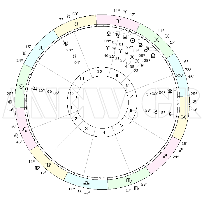 | | ΘΕΣΕΙΣ ΠΛΑΝΗΤΩΝ ΑΣΤΡΟΛΟΓΙΚΟΥ ΧΑΡΤΗ ΤΗΣ ΣΤΙΓΜΗΣ ΑΥΤΗΣ | | | | Πλανήτης | Ζώδιο | Μοίρες | Δεκαήμ. | Σε οίκο | Απόκλιση | | Ακμές των οίκων | | Ηλιος | Ιχθείς | 22°51' | Τρίτο | 10 | 02 S 50 | | 1ος | 09°09' | Καρκίνος | | Σελήνη | Αιγόκερως | 15°12' | Δεύτερο | 7 | 26 S 48 | | 2ος | 29°36' | Καρκίνος | | Ερμής | Ιχθείς | 11°18'R | Δεύτερο | 9 | 04 S 46 | | 3ος | 22°08' | Λέων | | Αφροδίτη | Κριός | 08°41' | Πρώτο | 10 | 02 N 27 | | 4ος | 19°58' | Παρθένος | | Αρης | Ιχθείς | 08°33' | Πρώτο | 9 | 09 S 22 | | 5ος | 25°09' | Ζυγός | | Δίας | Καρκίνος | 15°06' | Δεύτερο | 1 | 22 N 56 | | 6ος | 04°12' | Τοξότης | | Κρόνος | Κριός | 03°21' | Πρώτο | 10 | 00 S 37 | | 7ος | 09°09' | Αιγόκερως | | Ουρανός | Ταύρος | 28°04' | Τρίτο | 11 | 19 N 33 | | 8ος | 29°36' | Αιγόκερως | | Ποσειδώνας | Κριός | 01°30' | Πρώτο | 10 | 00 S 36 | | 9ος | 22°08' | Υδροχόος | | Πλούτωνας | Υδροχόος | 04°51' | Πρώτο | 8 | 22 S 50 | | 10ος | 19°58' | Ιχθείς | | Β. Δεσμός | Ιχθείς | 08°23' | Πρώτο | 9 | 08 S 25 | | 11ος | 25°09' | Κριός | | Ωροσκόπος | Καρκίνος | 09°09' | Πρώτο | | | 12ος | 04°12' | Δίδυμοι | | Μεσουράνημα | Ιχθείς | 19°58' | Δεύτερο | | | |