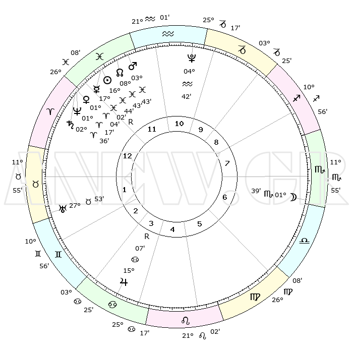 | | ΘΕΣΕΙΣ ΠΛΑΝΗΤΩΝ ΑΣΤΡΟΛΟΓΙΚΟΥ ΧΑΡΤΗ ΤΗΣ ΣΤΙΓΜΗΣ ΑΥΤΗΣ | | | | Πλανήτης | Ζώδιο | Μοίρες | Δεκαήμ. | Σε οίκο | Απόκλιση | | Ακμές των οίκων | | Ηλιος | Ιχθείς | 16°39' | Δεύτερο | 12 | 05 S 16 | | 1ος | 24°32' | Ιχθείς | | Σελήνη | Σκορπιός | 00°37' | Πρώτο | 7 | 15 S 33 | | 2ος | 06°06' | Ταύρος | | Ερμής | Ιχθείς | 17°07'R | Δεύτερο | 12 | 01 S 43 | | 3ος | 04°22' | Δίδυμοι | | Αφροδίτη | Κριός | 00°58' | Πρώτο | 1 | 00 S 45 | | 4ος | 26°56' | Δίδυμοι | | Αρης | Ιχθείς | 03°39' | Πρώτο | 12 | 11 S 11 | | 5ος | 19°01' | Καρκίνος | | Δίας | Καρκίνος | 15°07'R | Δεύτερο | 4 | 22 N 56 | | 6ος | 15°36' | Λέων | | Κρόνος | Κριός | 02°35' | Πρώτο | 1 | 00 S 55 | | 7ος | 24°32' | Παρθένος | | Ουρανός | Ταύρος | 27°53' | Τρίτο | 2 | 19 N 31 | | 8ος | 06°06' | Σκορπιός | | Ποσειδώνας | Κριός | 01°17' | Πρώτο | 1 | 00 S 41 | | 9ος | 04°22' | Τοξότης | | Πλούτωνας | Υδροχόος | 04°42' | Πρώτο | 11 | 22 S 51 | | 10ος | 26°56' | Τοξότης | | Β. Δεσμός | Ιχθείς | 08°43' | Πρώτο | 12 | 08 S 18 | | 11ος | 19°01' | Αιγόκερως | | Ωροσκόπος | Ιχθείς | 24°32' | Τρίτο | | | 12ος | 15°36' | Υδροχόος | | Μεσουράνημα | Τοξότης | 26°56' | Τρίτο | | | |