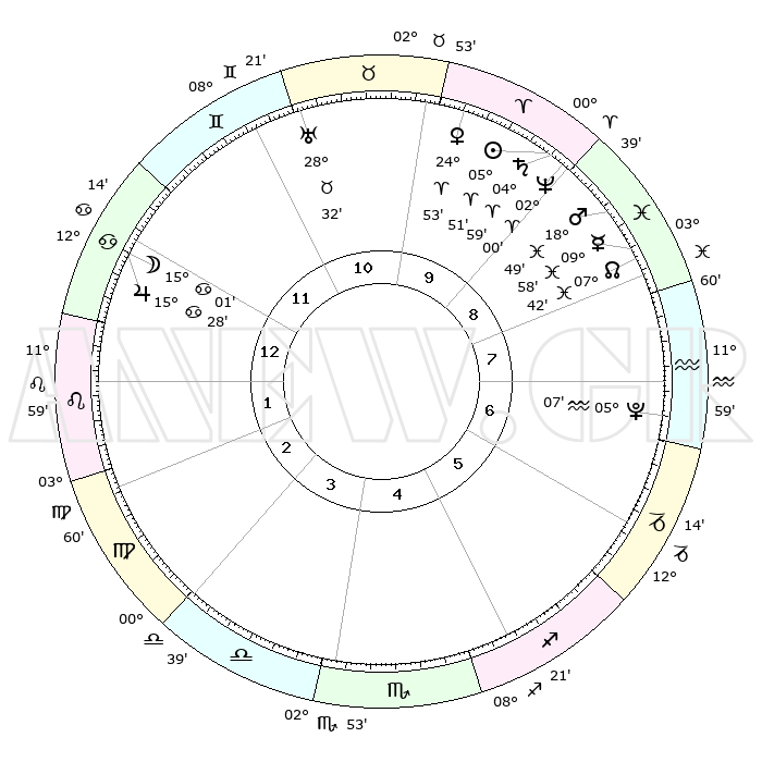 | | ΘΕΣΕΙΣ ΠΛΑΝΗΤΩΝ ΑΣΤΡΟΛΟΓΙΚΟΥ ΧΑΡΤΗ ΤΗΣ ΣΤΙΓΜΗΣ ΑΥΤΗΣ | | | | Πλανήτης | Ζώδιο | Μοίρες | Δεκαήμ. | Σε οίκο | Απόκλιση | | Ακμές των οίκων | | Ηλιος | Κριός | 05°48' | Πρώτο | 9 | 02 N 18 | | 1ος | 24°09' | Καρκίνος | | Σελήνη | Καρκίνος | 14°10' | Δεύτερο | 12 | 26 N 55 | | 2ος | 14°51' | Λέων | | Ερμής | Ιχθείς | 09°56' | Πρώτο | 9 | 08 S 07 | | 3ος | 09°08' | Παρθένος | | Αφροδίτη | Κριός | 24°48' | Τρίτο | 10 | 08 N 59 | | 4ος | 09°22' | Ζυγός | | Αρης | Ιχθείς | 18°47' | Δεύτερο | 9 | 05 S 25 | | 5ος | 15°27' | Σκορπιός | | Δίας | Καρκίνος | 15°28' | Δεύτερο | 12 | 22 N 54 | | 6ος | 22°09' | Τοξότης | | Κρόνος | Κριός | 04°58' | Πρώτο | 9 | 00 N 01 | | 7ος | 24°09' | Αιγόκερως | | Ουρανός | Ταύρος | 28°32' | Τρίτο | 11 | 19 N 40 | | 8ος | 14°51' | Υδροχόος | | Ποσειδώνας | Κριός | 02°00' | Πρώτο | 9 | 00 S 24 | | 9ος | 09°08' | Ιχθείς | | Πλούτωνας | Υδροχόος | 05°07' | Πρώτο | 7 | 22 S 48 | | 10ος | 09°22' | Κριός | | Β. Δεσμός | Ιχθείς | 07°42' | Πρώτο | 8 | 08 S 41 | | 11ος | 15°27' | Ταύρος | | Ωροσκόπος | Καρκίνος | 24°09' | Τρίτο | | | 12ος | 22°09' | Δίδυμοι | | Μεσουράνημα | Κριός | 09°22' | Πρώτο | | | |