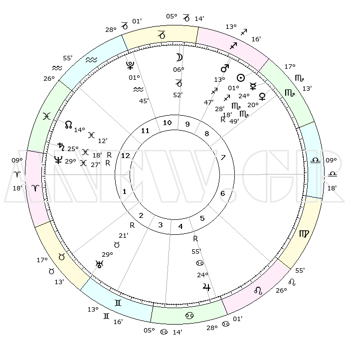 | | ΘΕΣΕΙΣ ΠΛΑΝΗΤΩΝ ΑΣΤΡΟΛΟΓΙΚΟΥ ΧΑΡΤΗ ΤΗΣ ΣΤΙΓΜΗΣ ΑΥΤΗΣ | | | | Πλανήτης | Ζώδιο | Μοίρες | Δεκαήμ. | Σε οίκο | Απόκλιση | | Ακμές των οίκων | | Ηλιος | Τοξότης | 01°24' | Πρώτο | 9 | 20 S 26 | | 1ος | 25°18' | Υδροχόος | | Σελήνη | Αιγόκερως | 05°57' | Πρώτο | 11 | 27 S 58 | | 2ος | 11°00' | Κριός | | Ερμής | Σκορπιός | 24°24'R | Τρίτο | 9 | 17 S 25 | | 3ος | 14°39' | Ταύρος | | Αφροδίτη | Σκορπιός | 20°43' | Τρίτο | 9 | 17 S 00 | | 4ος | 09°33' | Δίδυμοι | | Αρης | Τοξότης | 13°44' | Δεύτερο | 10 | 23 S 02 | | 5ος | 01°16' | Καρκίνος | | Δίας | Καρκίνος | 24°55'R | Τρίτο | 6 | 21 N 17 | | 6ος | 24°22' | Καρκίνος | | Κρόνος | Ιχθείς | 25°18'R | Τρίτο | 1 | 04 S 04 | | 7ος | 25°18' | Λέων | | Ουρανός | Ταύρος | 29°22'R | Τρίτο | 3 | 19 N 48 | | 8ος | 11°00' | Ζυγός | | Ποσειδώνας | Ιχθείς | 29°27'R | Τρίτο | 1 | 01 S 28 | | 9ος | 14°39' | Σκορπιός | | Πλούτωνας | Υδροχόος | 01°45' | Πρώτο | 12 | 23 S 26 | | 10ος | 09°33' | Τοξότης | | Β. Δεσμός | Ιχθείς | 14°13' | Δεύτερο | 1 | 06 S 13 | | 11ος | 01°16' | Αιγόκερως | | Ωροσκόπος | Υδροχόος | 25°18' | Τρίτο | | | 12ος | 24°22' | Αιγόκερως | | Μεσουράνημα | Τοξότης | 09°33' | Πρώτο | | | |