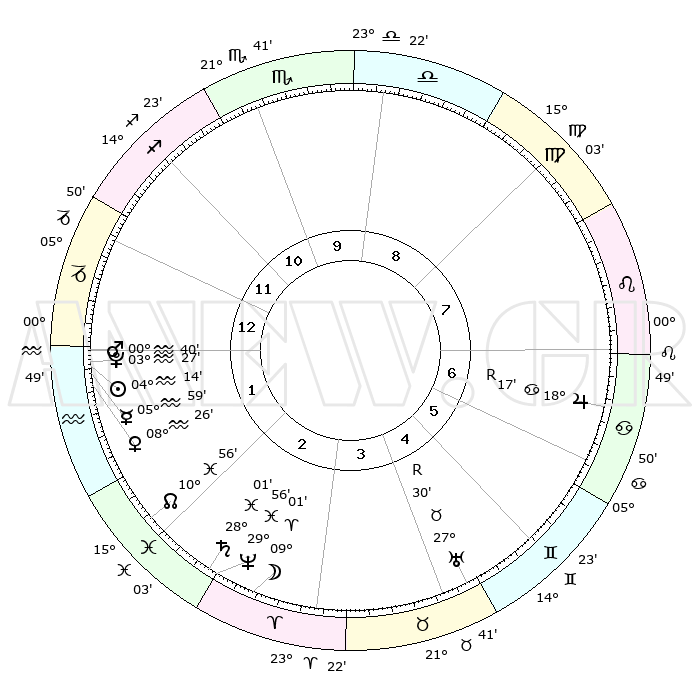 | | ΘΕΣΕΙΣ ΠΛΑΝΗΤΩΝ ΑΣΤΡΟΛΟΓΙΚΟΥ ΧΑΡΤΗ ΤΗΣ ΣΤΙΓΜΗΣ ΑΥΤΗΣ | | | | Πλανήτης | Ζώδιο | Μοίρες | Δεκαήμ. | Σε οίκο | Απόκλιση | | Ακμές των οίκων | | Ηλιος | Υδροχόος | 04°10' | Πρώτο | 1 | 19 S 13 | | 1ος | 05°35' | Αιγόκερως | | Σελήνη | Κριός | 08°07' | Πρώτο | 3 | 05 N 32 | | 2ος | 14°09' | Υδροχόος | | Ερμής | Υδροχόος | 05°52' | Πρώτο | 1 | 20 S 49 | | 3ος | 24°26' | Ιχθείς | | Αφροδίτη | Υδροχόος | 08°21' | Πρώτο | 1 | 19 S 21 | | 4ος | 27°25' | Κριός | | Αρης | Υδροχόος | 00°37' | Πρώτο | 1 | 21 S 00 | | 5ος | 22°53' | Ταύρος | | Δίας | Καρκίνος | 18°17'R | Δεύτερο | 7 | 22 N 28 | | 6ος | 14°22' | Δίδυμοι | | Κρόνος | Ιχθείς | 28°01' | Τρίτο | 3 | 02 S 48 | | 7ος | 05°35' | Καρκίνος | | Ουρανός | Ταύρος | 27°30'R | Τρίτο | 5 | 19 N 25 | | 8ος | 14°09' | Λέων | | Ποσειδώνας | Ιχθείς | 29°56' | Τρίτο | 3 | 01 S 14 | | 9ος | 24°26' | Παρθένος | | Πλούτωνας | Υδροχόος | 03°27' | Πρώτο | 1 | 23 S 04 | | 10ος | 27°25' | Ζυγός | | Β. Δεσμός | Ιχθείς | 10°57' | Δεύτερο | 2 | 07 S 28 | | 11ος | 22°53' | Σκορπιός | | Ωροσκόπος | Αιγόκερως | 05°35' | Πρώτο | | | 12ος | 14°22' | Τοξότης | | Μεσουράνημα | Ζυγός | 27°25' | Τρίτο | | | |