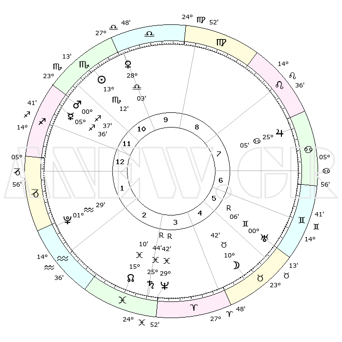 | | ΘΕΣΕΙΣ ΠΛΑΝΗΤΩΝ ΑΣΤΡΟΛΟΓΙΚΟΥ ΧΑΡΤΗ ΤΗΣ ΣΤΙΓΜΗΣ ΑΥΤΗΣ | | | | Πλανήτης | Ζώδιο | Μοίρες | Δεκαήμ. | Σε οίκο | Απόκλιση | | Ακμές των οίκων | | Ηλιος | Σκορπιός | 13°04' | Δεύτερο | 12 | 15 S 45 | | 1ος | 23°31' | Σκορπιός | | Σελήνη | Ταύρος | 08°35' | Πρώτο | 6 | 18 N 09 | | 2ος | 23°50' | Τοξότης | | Ερμής | Τοξότης | 05°31' | Πρώτο | 1 | 23 S 59 | | 3ος | 28°30' | Αιγόκερως | | Αφροδίτη | Ζυγός | 27°53' | Τρίτο | 11 | 09 S 24 | | 4ος | 04°18' | Ιχθείς | | Αρης | Τοξότης | 00°31' | Πρώτο | 1 | 20 S 41 | | 5ος | 06°04' | Κριός | | Δίας | Καρκίνος | 25°05' | Τρίτο | 8 | 21 N 12 | | 6ος | 01°59' | Ταύρος | | Κρόνος | Ιχθείς | 25°45'R | Τρίτο | 4 | 03 S 57 | | 7ος | 23°31' | Ταύρος | | Ουρανός | Δίδυμοι | 00°06'R | Πρώτο | 7 | 19 N 58 | | 8ος | 23°50' | Δίδυμοι | | Ποσειδώνας | Ιχθείς | 29°42'R | Τρίτο | 4 | 01 S 22 | | 9ος | 28°30' | Καρκίνος | | Πλούτωνας | Υδροχόος | 01°29' | Πρώτο | 3 | 23 S 30 | | 10ος | 04°18' | Παρθένος | | Β. Δεσμός | Ιχθείς | 15°11' | Δεύτερο | 4 | 05 S 50 | | 11ος | 06°04' | Ζυγός | | Ωροσκόπος | Σκορπιός | 23°31' | Τρίτο | | | 12ος | 01°59' | Σκορπιός | | Μεσουράνημα | Παρθένος | 04°18' | Πρώτο | | | |