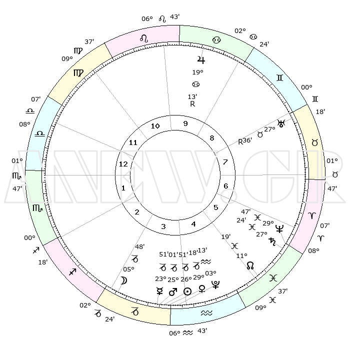 | | ΘΕΣΕΙΣ ΠΛΑΝΗΤΩΝ ΑΣΤΡΟΛΟΓΙΚΟΥ ΧΑΡΤΗ ΤΗΣ ΣΤΙΓΜΗΣ ΑΥΤΗΣ | | | | Πλανήτης | Ζώδιο | Μοίρες | Δεκαήμ. | Σε οίκο | Απόκλιση | | Ακμές των οίκων | | Ηλιος | Αιγόκερως | 26°46' | Τρίτο | 4 | 20 S 48 | | 1ος | 07°59' | Ζυγός | | Σελήνη | Αιγόκερως | 04°49' | Πρώτο | 3 | 28 S 00 | | 2ος | 05°07' | Σκορπιός | | Ερμής | Αιγόκερως | 23°43' | Τρίτο | 4 | 23 S 12 | | 3ος | 05°52' | Τοξότης | | Αφροδίτη | Αιγόκερως | 29°12' | Τρίτο | 4 | 21 S 19 | | 4ος | 08°59' | Αιγόκερως | | Αρης | Αιγόκερως | 24°57' | Τρίτο | 4 | 22 S 06 | | 5ος | 11°55' | Υδροχόος | | Δίας | Καρκίνος | 19°14'R | Δεύτερο | 10 | 22 N 20 | | 6ος | 12°01' | Ιχθείς | | Κρόνος | Ιχθείς | 27°24' | Τρίτο | 6 | 03 S 04 | | 7ος | 07°59' | Κριός | | Ουρανός | Ταύρος | 27°36'R | Τρίτο | 8 | 19 N 26 | | 8ος | 05°07' | Ταύρος | | Ποσειδώνας | Ιχθείς | 29°46' | Τρίτο | 6 | 01 S 18 | | 9ος | 05°52' | Δίδυμοι | | Πλούτωνας | Υδροχόος | 03°13' | Πρώτο | 4 | 23 S 07 | | 10ος | 08°59' | Καρκίνος | | Β. Δεσμός | Ιχθείς | 11°20' | Δεύτερο | 5 | 07 S 19 | | 11ος | 11°55' | Λέων | | Ωροσκόπος | Ζυγός | 07°59' | Πρώτο | | | 12ος | 12°02' | Παρθένος | | Μεσουράνημα | Καρκίνος | 08°59' | Πρώτο | | | |