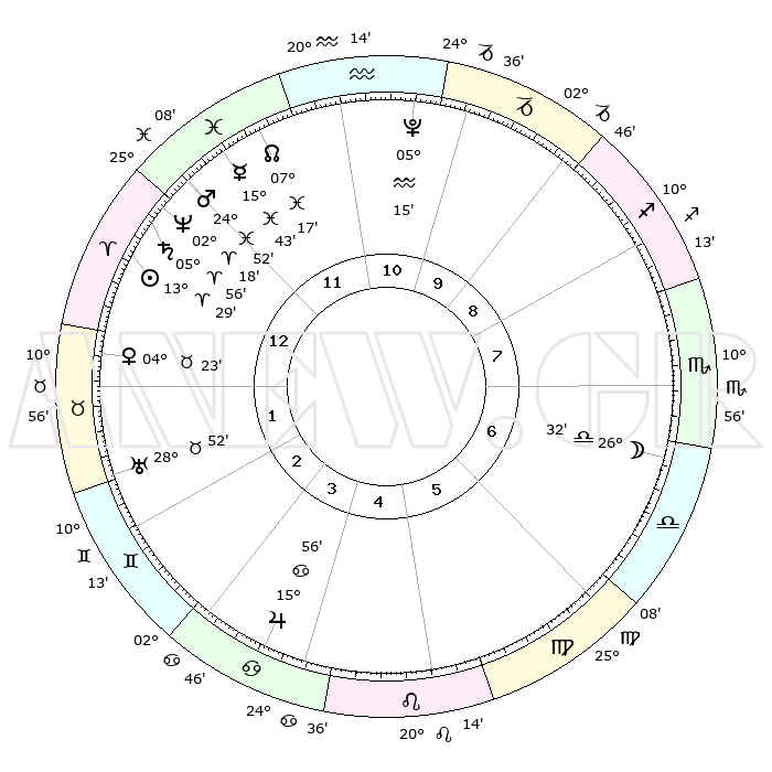 | | ΘΕΣΕΙΣ ΠΛΑΝΗΤΩΝ ΑΣΤΡΟΛΟΓΙΚΟΥ ΧΑΡΤΗ ΤΗΣ ΣΤΙΓΜΗΣ ΑΥΤΗΣ | | | | Πλανήτης | Ζώδιο | Μοίρες | Δεκαήμ. | Σε οίκο | Απόκλιση | | Ακμές των οίκων | | Ηλιος | Κριός | 13°25' | Δεύτερο | 1 | 05 N 18 | | 1ος | 05°15' | Κριός | | Σελήνη | Ζυγός | 25°43' | Τρίτο | 7 | 13 S 28 | | 2ος | 14°14' | Ταύρος | | Ερμής | Ιχθείς | 15°39' | Δεύτερο | 12 | 07 S 09 | | 3ος | 10°51' | Δίδυμοι | | Αφροδίτη | Ταύρος | 04°19' | Πρώτο | 1 | 12 N 37 | | 4ος | 02°57' | Καρκίνος | | Αρης | Ιχθείς | 24°49' | Τρίτο | 12 | 03 S 01 | | 5ος | 25°30' | Καρκίνος | | Δίας | Καρκίνος | 15°56' | Δεύτερο | 4 | 22 N 51 | | 6ος | 23°44' | Λέων | | Κρόνος | Κριός | 05°56' | Πρώτο | 1 | 00 N 24 | | 7ος | 05°15' | Ζυγός | | Ουρανός | Ταύρος | 28°52' | Τρίτο | 2 | 19 N 44 | | 8ος | 14°14' | Σκορπιός | | Ποσειδώνας | Κριός | 02°17' | Πρώτο | 12 | 00 S 17 | | 9ος | 10°51' | Τοξότης | | Πλούτωνας | Υδροχόος | 05°15' | Πρώτο | 11 | 22 S 47 | | 10ος | 02°57' | Αιγόκερως | | Β. Δεσμός | Ιχθείς | 07°17' | Πρώτο | 12 | 08 S 50 | | 11ος | 25°30' | Αιγόκερως | | Ωροσκόπος | Κριός | 05°15' | Πρώτο | | | 12ος | 23°44' | Υδροχόος | | Μεσουράνημα | Αιγόκερως | 02°57' | Πρώτο | | | |