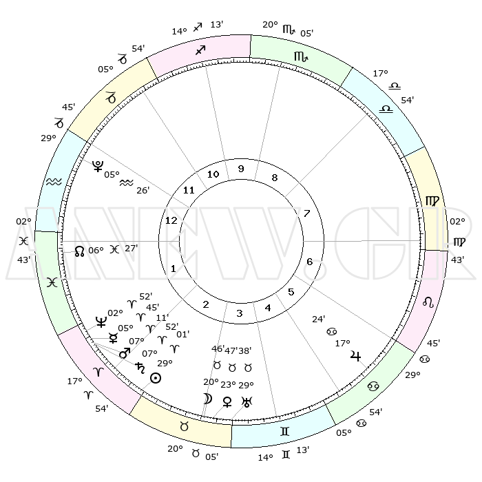 | | ΘΕΣΕΙΣ ΠΛΑΝΗΤΩΝ ΑΣΤΡΟΛΟΓΙΚΟΥ ΧΑΡΤΗ ΤΗΣ ΣΤΙΓΜΗΣ ΑΥΤΗΣ | | | | Πλανήτης | Ζώδιο | Μοίρες | Δεκαήμ. | Σε οίκο | Απόκλιση | | Ακμές των οίκων | | Ηλιος | Κριός | 28°57' | Τρίτο | 3 | 11 N 06 | | 1ος | 28°31' | Αιγόκερως | | Σελήνη | Ταύρος | 19°42' | Δεύτερο | 3 | 22 N 20 | | 2ος | 12°22' | Ιχθείς | | Ερμής | Κριός | 05°39' | Πρώτο | 2 | 00 S 11 | | 3ος | 21°02' | Κριός | | Αφροδίτη | Ταύρος | 23°42' | Τρίτο | 4 | 19 N 02 | | 4ος | 19°46' | Ταύρος | | Αρης | Κριός | 07°08' | Πρώτο | 2 | 01 N 57 | | 5ος | 12°38' | Δίδυμοι | | Δίας | Καρκίνος | 17°24' | Δεύτερο | 6 | 22 N 41 | | 6ος | 04°00' | Καρκίνος | | Κρόνος | Κριός | 07°52' | Πρώτο | 2 | 01 N 09 | | 7ος | 28°31' | Καρκίνος | | Ουρανός | Ταύρος | 29°38' | Τρίτο | 4 | 19 N 54 | | 8ος | 12°22' | Παρθένος | | Ποσειδώνας | Κριός | 02°52' | Πρώτο | 2 | 00 S 04 | | 9ος | 21°02' | Ζυγός | | Πλούτωνας | Υδροχόος | 05°26' | Πρώτο | 1 | 22 S 47 | | 10ος | 19°46' | Σκορπιός | | Β. Δεσμός | Ιχθείς | 06°27' | Πρώτο | 1 | 09 S 09 | | 11ος | 12°38' | Τοξότης | | Ωροσκόπος | Αιγόκερως | 28°31' | Τρίτο | | | 12ος | 04°00' | Αιγόκερως | | Μεσουράνημα | Σκορπιός | 19°46' | Δεύτερο | | | |