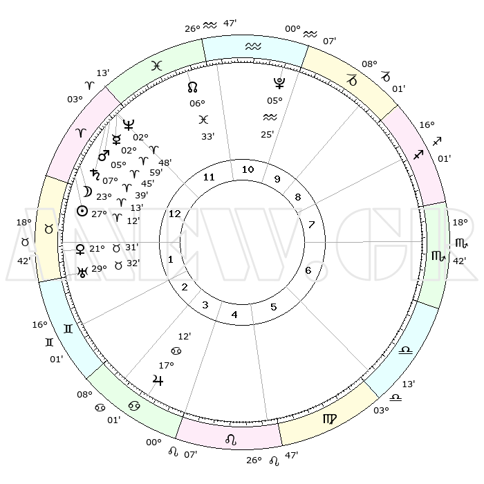 | | ΘΕΣΕΙΣ ΠΛΑΝΗΤΩΝ ΑΣΤΡΟΛΟΓΙΚΟΥ ΧΑΡΤΗ ΤΗΣ ΣΤΙΓΜΗΣ ΑΥΤΗΣ | | | | Πλανήτης | Ζώδιο | Μοίρες | Δεκαήμ. | Σε οίκο | Απόκλιση | | Ακμές των οίκων | | Ηλιος | Κριός | 27°10' | Τρίτο | 1 | 10 N 27 | | 1ος | 23°40' | Κριός | | Σελήνη | Κριός | 22°30' | Τρίτο | 12 | 12 N 06 | | 2ος | 27°39' | Ταύρος | | Ερμής | Κριός | 02°54' | Πρώτο | 12 | 01 S 16 | | 3ος | 21°53' | Δίδυμοι | | Αφροδίτη | Ταύρος | 21°28' | Τρίτο | 1 | 18 N 23 | | 4ος | 13°35' | Καρκίνος | | Αρης | Κριός | 05°43' | Πρώτο | 12 | 01 N 23 | | 5ος | 07°24' | Λέων | | Δίας | Καρκίνος | 17°12' | Δεύτερο | 4 | 22 N 42 | | 6ος | 08°53' | Παρθένος | | Κρόνος | Κριός | 07°39' | Πρώτο | 12 | 01 N 04 | | 7ος | 23°40' | Ζυγός | | Ουρανός | Ταύρος | 29°32' | Τρίτο | 2 | 19 N 53 | | 8ος | 27°39' | Σκορπιός | | Ποσειδώνας | Κριός | 02°48' | Πρώτο | 12 | 00 S 06 | | 9ος | 21°53' | Τοξότης | | Πλούτωνας | Υδροχόος | 05°25' | Πρώτο | 10 | 22 S 47 | | 10ος | 13°35' | Αιγόκερως | | Β. Δεσμός | Ιχθείς | 06°33' | Πρώτο | 11 | 09 S 06 | | 11ος | 07°24' | Υδροχόος | | Ωροσκόπος | Κριός | 23°40' | Τρίτο | | | 12ος | 08°53' | Ιχθείς | | Μεσουράνημα | Αιγόκερως | 13°35' | Δεύτερο | | | |