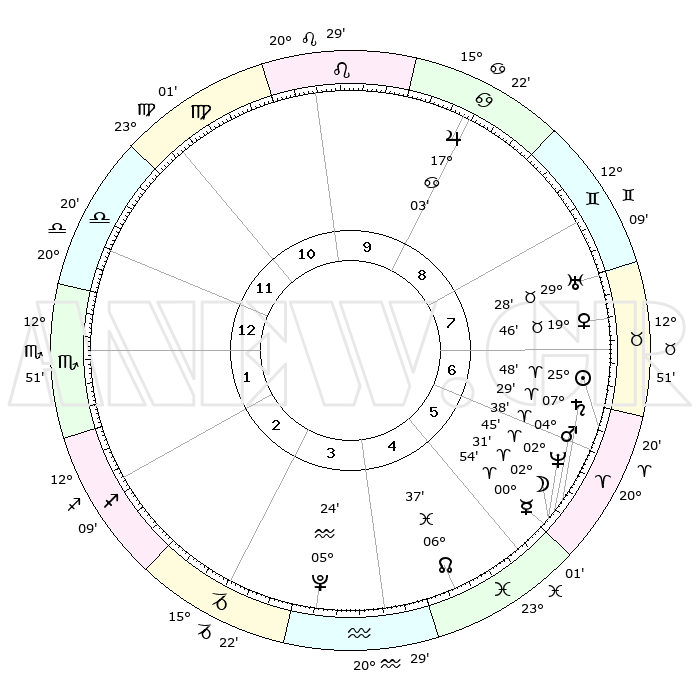 | | ΘΕΣΕΙΣ ΠΛΑΝΗΤΩΝ ΑΣΤΡΟΛΟΓΙΚΟΥ ΧΑΡΤΗ ΤΗΣ ΣΤΙΓΜΗΣ ΑΥΤΗΣ | | | | Πλανήτης | Ζώδιο | Μοίρες | Δεκαήμ. | Σε οίκο | Απόκλιση | | Ακμές των οίκων | | Ηλιος | Κριός | 25°44' | Τρίτο | 7 | 09 N 57 | | 1ος | 24°05' | Ζυγός | | Σελήνη | Κριός | 01°36' | Πρώτο | 6 | 02 N 31 | | 2ος | 22°09' | Σκορπιός | | Ερμής | Κριός | 00°48' | Πρώτο | 6 | 02 S 05 | | 3ος | 23°41' | Τοξότης | | Αφροδίτη | Ταύρος | 19°41' | Δεύτερο | 7 | 17 N 51 | | 4ος | 27°30' | Αιγόκερως | | Αρης | Κριός | 04°35' | Πρώτο | 6 | 00 N 55 | | 5ος | 00°27' | Ιχθείς | | Δίας | Καρκίνος | 17°02' | Δεύτερο | 9 | 22 N 44 | | 6ος | 29°37' | Ιχθείς | | Κρόνος | Κριός | 07°28' | Πρώτο | 6 | 01 N 00 | | 7ος | 24°05' | Κριός | | Ουρανός | Ταύρος | 29°28' | Τρίτο | 8 | 19 N 52 | | 8ος | 22°09' | Ταύρος | | Ποσειδώνας | Κριός | 02°45' | Πρώτο | 6 | 00 S 07 | | 9ος | 23°41' | Δίδυμοι | | Πλούτωνας | Υδροχόος | 05°24' | Πρώτο | 4 | 22 S 47 | | 10ος | 27°30' | Καρκίνος | | Β. Δεσμός | Ιχθείς | 06°38' | Πρώτο | 5 | 09 S 05 | | 11ος | 00°27' | Παρθένος | | Ωροσκόπος | Ζυγός | 24°05' | Τρίτο | | | 12ος | 29°37' | Παρθένος | | Μεσουράνημα | Καρκίνος | 27°30' | Τρίτο | | | |