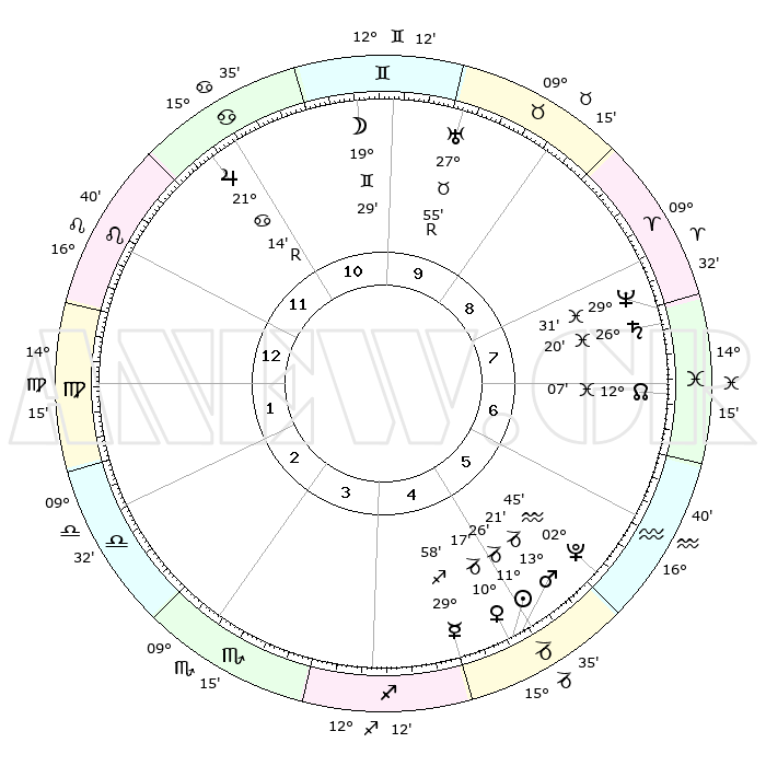 | | ΘΕΣΕΙΣ ΠΛΑΝΗΤΩΝ ΑΣΤΡΟΛΟΓΙΚΟΥ ΧΑΡΤΗ ΤΗΣ ΣΤΙΓΜΗΣ ΑΥΤΗΣ | | | | Πλανήτης | Ζώδιο | Μοίρες | Δεκαήμ. | Σε οίκο | Απόκλιση | | Ακμές των οίκων | | Ηλιος | Αιγόκερως | 11°22' | Δεύτερο | 5 | 22 S 57 | | 1ος | 23°23' | Λέων | | Σελήνη | Δίδυμοι | 18°25' | Δεύτερο | 10 | 27 N 56 | | 2ος | 16°33' | Παρθένος | | Ερμής | Τοξότης | 29°51' | Τρίτο | 5 | 24 S 05 | | 3ος | 14°34' | Ζυγός | | Αφροδίτη | Αιγόκερως | 10°12' | Δεύτερο | 5 | 23 S 34 | | 4ος | 17°21' | Σκορπιός | | Αρης | Αιγόκερως | 13°18' | Δεύτερο | 5 | 23 S 40 | | 5ος | 22°01' | Τοξότης | | Δίας | Καρκίνος | 21°15'R | Τρίτο | 11 | 22 N 00 | | 6ος | 24°33' | Αιγόκερως | | Κρόνος | Ιχθείς | 26°20' | Τρίτο | 8 | 03 S 32 | | 7ος | 23°23' | Υδροχόος | | Ουρανός | Ταύρος | 27°55'R | Τρίτο | 10 | 19 N 30 | | 8ος | 16°33' | Ιχθείς | | Ποσειδώνας | Ιχθείς | 29°31' | Τρίτο | 8 | 01 S 25 | | 9ος | 14°34' | Κριός | | Πλούτωνας | Υδροχόος | 02°45' | Πρώτο | 6 | 23 S 13 | | 10ος | 17°21' | Ταύρος | | Β. Δεσμός | Ιχθείς | 12°08' | Δεύτερο | 7 | 07 S 01 | | 11ος | 22°01' | Δίδυμοι | | Ωροσκόπος | Λέων | 23°23' | Τρίτο | | | 12ος | 24°33' | Καρκίνος | | Μεσουράνημα | Ταύρος | 17°21' | Δεύτερο | | | |