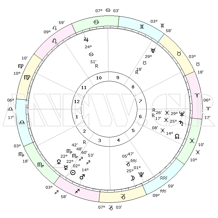 | | ΘΕΣΕΙΣ ΠΛΑΝΗΤΩΝ ΑΣΤΡΟΛΟΓΙΚΟΥ ΧΑΡΤΗ ΤΗΣ ΣΤΙΓΜΗΣ ΑΥΤΗΣ | | | | Πλανήτης | Ζώδιο | Μοίρες | Δεκαήμ. | Σε οίκο | Απόκλιση | | Ακμές των οίκων | | Ηλιος | Τοξότης | 02°51' | Πρώτο | 4 | 20 S 44 | | 1ος | 27°08' | Λέων | | Σελήνη | Αιγόκερως | 23°28' | Τρίτο | 5 | 25 S 15 | | 2ος | 20°41' | Παρθένος | | Ερμής | Σκορπιός | 22°55'R | Τρίτο | 4 | 16 S 42 | | 3ος | 19°05' | Ζυγός | | Αφροδίτη | Σκορπιός | 22°32' | Τρίτο | 4 | 17 S 31 | | 4ος | 21°58' | Σκορπιός | | Αρης | Τοξότης | 14°48' | Δεύτερο | 4 | 23 S 10 | | 5ος | 26°21' | Τοξότης | | Δίας | Καρκίνος | 24°52'R | Τρίτο | 11 | 21 N 18 | | 6ος | 28°33' | Αιγόκερως | | Κρόνος | Ιχθείς | 25°17'R | Τρίτο | 8 | 04 S 04 | | 7ος | 27°08' | Υδροχόος | | Ουρανός | Ταύρος | 29°18'R | Τρίτο | 10 | 19 N 48 | | 8ος | 20°41' | Ιχθείς | | Ποσειδώνας | Ιχθείς | 29°26'R | Τρίτο | 8 | 01 S 28 | | 9ος | 19°05' | Κριός | | Πλούτωνας | Υδροχόος | 01°47' | Πρώτο | 6 | 23 S 26 | | 10ος | 21°58' | Ταύρος | | Β. Δεσμός | Ιχθείς | 14°08' | Δεύτερο | 7 | 06 S 14 | | 11ος | 26°21' | Δίδυμοι | | Ωροσκόπος | Λέων | 27°08' | Τρίτο | | | 12ος | 28°33' | Καρκίνος | | Μεσουράνημα | Ταύρος | 21°58' | Τρίτο | | | |