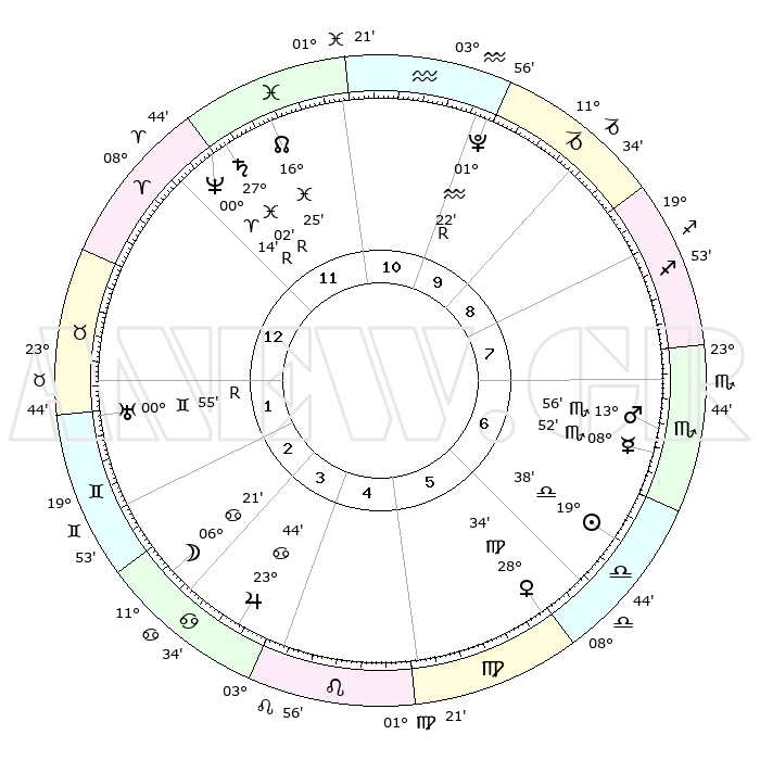 | ΘΕΣΕΙΣ ΠΛΑΝΗΤΩΝ ΑΣΤΡΟΛΟΓΙΚΟΥ ΧΑΡΤΗ ΤΗΣ ΣΤΙΓΜΗΣ ΑΥΤΗΣ | | Πλανήτης | Ζώδιο | Μοίρες | Δεκαήμ. | Σε οίκο | Απόκλιση | | Ακμές των οίκων | Ηλιος | Ζυγός | 19°32' | Δεύτερο | 7 | 07 S 38 | | 1ος | 24°55' | Ιχθείς | Σελήνη | Καρκίνος | 04°49' | Πρώτο | 4 | 28 N 20 | | 2ος | 06°24' | Ταύρος | Ερμής | Σκορπιός | 08°42' | Πρώτο | 8 | 15 S 48 | | 3ος | 04°36' | Δίδυμοι | Αφροδίτη | Παρθένος | 28°26' | Τρίτο | 7 | 01 N 59 | | 4ος | 27°09' | Δίδυμοι | Αρης | Σκορπιός | 13°51' | Δεύτερο | 8 | 16 S 11 | | 5ος | 19°15' | Καρκίνος | Δίας | Καρκίνος | 23°43' | Τρίτο | 5 | 21 N 24 | | 6ος | 15°54' | Λέων | Κρόνος | Ιχθείς | 27°03'R | Τρίτο | 1 | 03 S 28 | | 7ος | 24°55' | Παρθένος | Ουρανός | Δίδυμοι | 00°55'R | Πρώτο | 2 | 20 N 08 | | 8ος | 06°24' | Σκορπιός | Ποσειδώνας | Κριός | 00°14'R | Πρώτο | 1 | 01 S 10 | | 9ος | 04°36' | Τοξότης | Πλούτωνας | Υδροχόος | 01°22'R | Πρώτο | 11 | 23 S 32 | | 10ος | 27°09' | Τοξότης | Β. Δεσμός | Ιχθείς | 16°26' | Δεύτερο | 12 | 05 S 21 | | 11ος | 19°15' | Αιγόκερως | Ωροσκόπος | Ιχθείς | 24°55' | Τρίτο | | | 12ος | 15°54' | Υδροχόος | Μεσουράνημα | Τοξότης | 27°09' | Τρίτο | | | |
